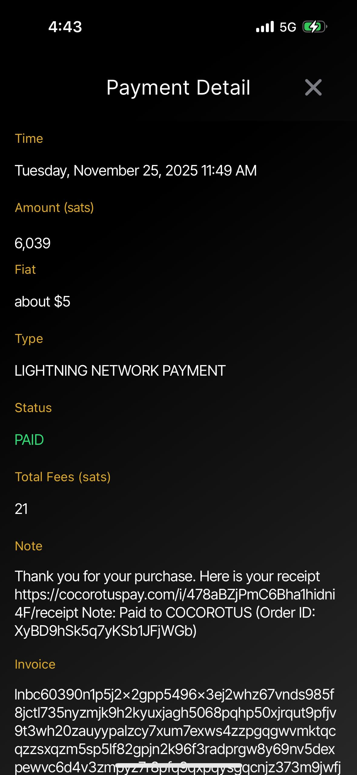 Parked outside the office was a food truck called "Cocorotus". If you search Tokyo in btcmap.org, you'll see Cocorotus everywhere. Apparently, it is a food truck chain that has embraced bitcoin. I couldn't miss this opportunity to spend bitcoin in-person, so I ordered their Singaporean chicken rice. The server was friendly and could tell by the look on my face that I wanted to pay in bitcoin. He showed me the QR code which opened a LN address, and I paid using Wallet of Satoshi, about 6,000 sats (¥800/$5). It was smooth as butter, but I did reflect on this post (#1272936), since instead of using a lightning invoice they had me enter the amount of sats myself. I wonder if I entered 600 and then just quickly showed him my confirmation screen, whether I could have scammed him.