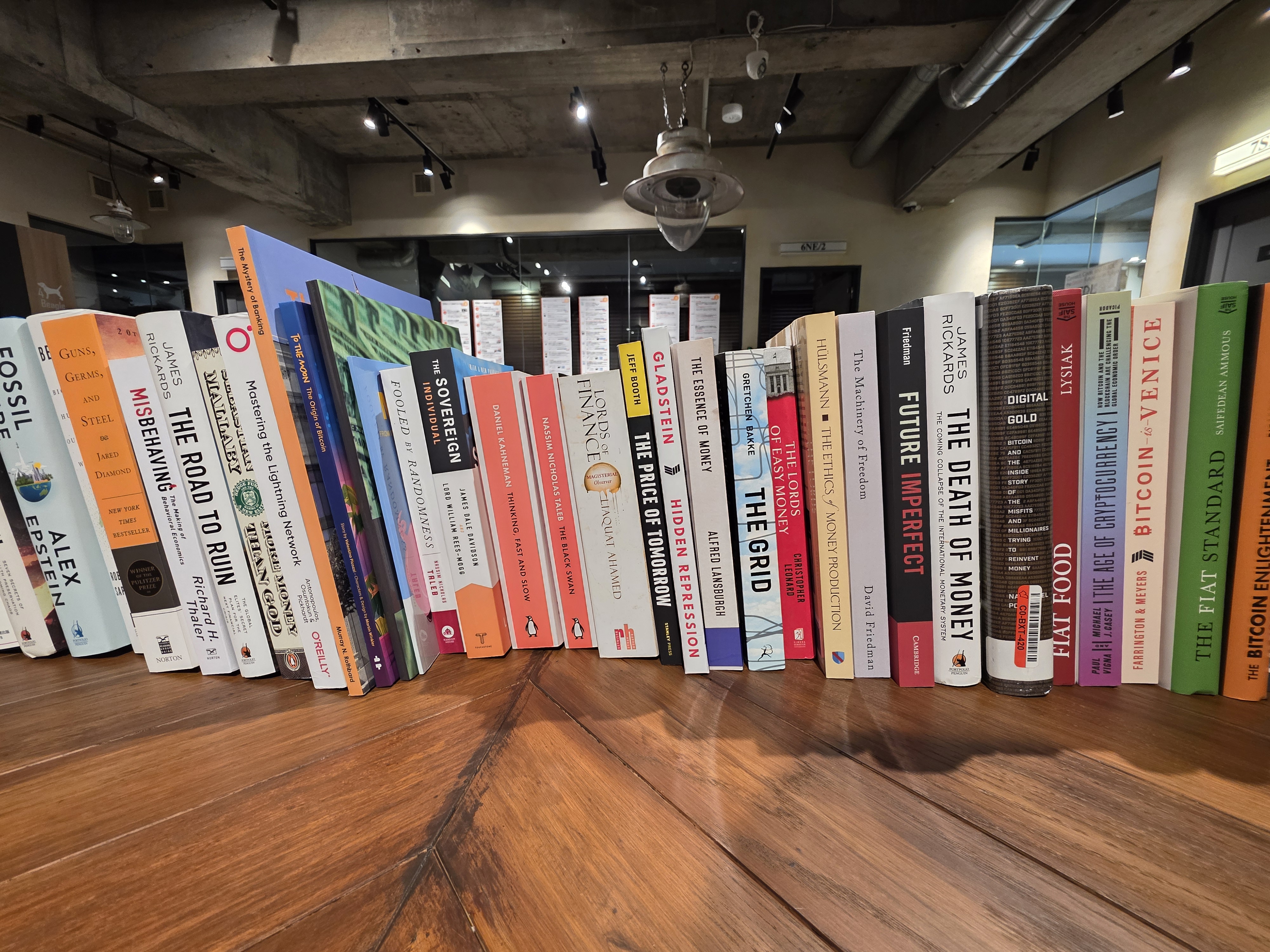 Inside on the first floor is a lounge space, already pictured above. It's got a variety of bitcoin related paraphernalia, including copies of Bitcoin Magazine, hardcover copies of Saif's The Bitcoin Standard and Principles of Economics, "Here Comes Bitcoin" plushies, and other stuff.