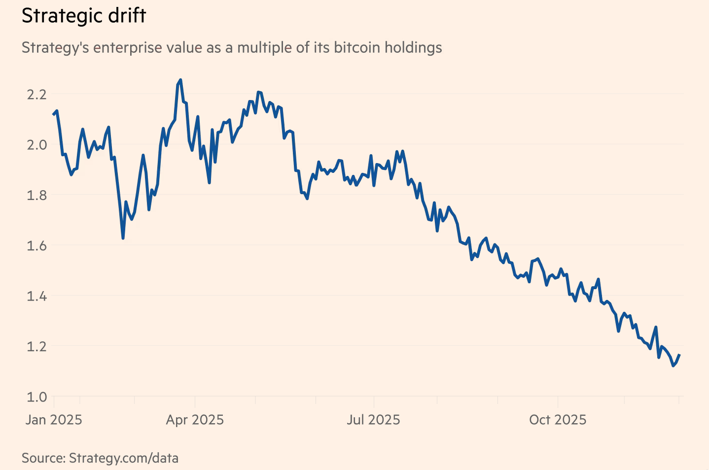 That doesn’t bode well for Strategy. To thrive, rather than survive, it needs to trade at a premium to its underlying bitcoin, which it did until recently. That helps it to sell preferred shares that convert at higher future prices, providing it with cheap capital to invest in more bitcoin.
