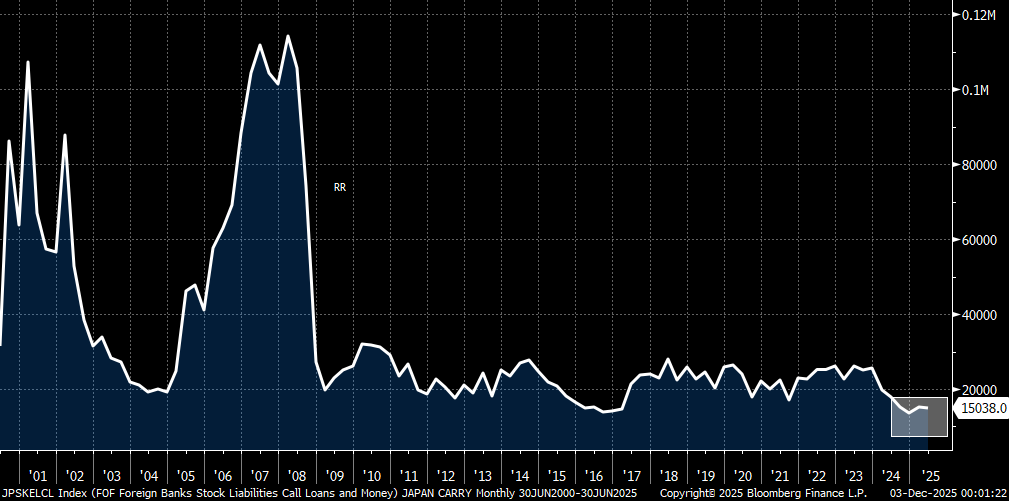 Bank Funding (Call Money) In 2008, foreign banks held peaks of ¥114 trillion in short-term loans in Japan – the classic fuel of global leverage. Today? We are at the lows, near ¥15 trillion. Structural funding in Yen has dried up.