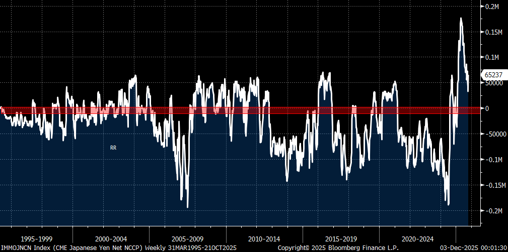 Speculative Positioning (CFTC) At the beginning of 2024, the market carried a massive short position in Yen (-200,000 contracts). When the Bank of Japan signaled normalization, we saw the August "purge." The scenario today? It's reversed. The market is long (Net Long +65k contracts). The speculative "weak hand" has already been eliminated. There is no longer pent-up selling pressure to cause a squeeze.