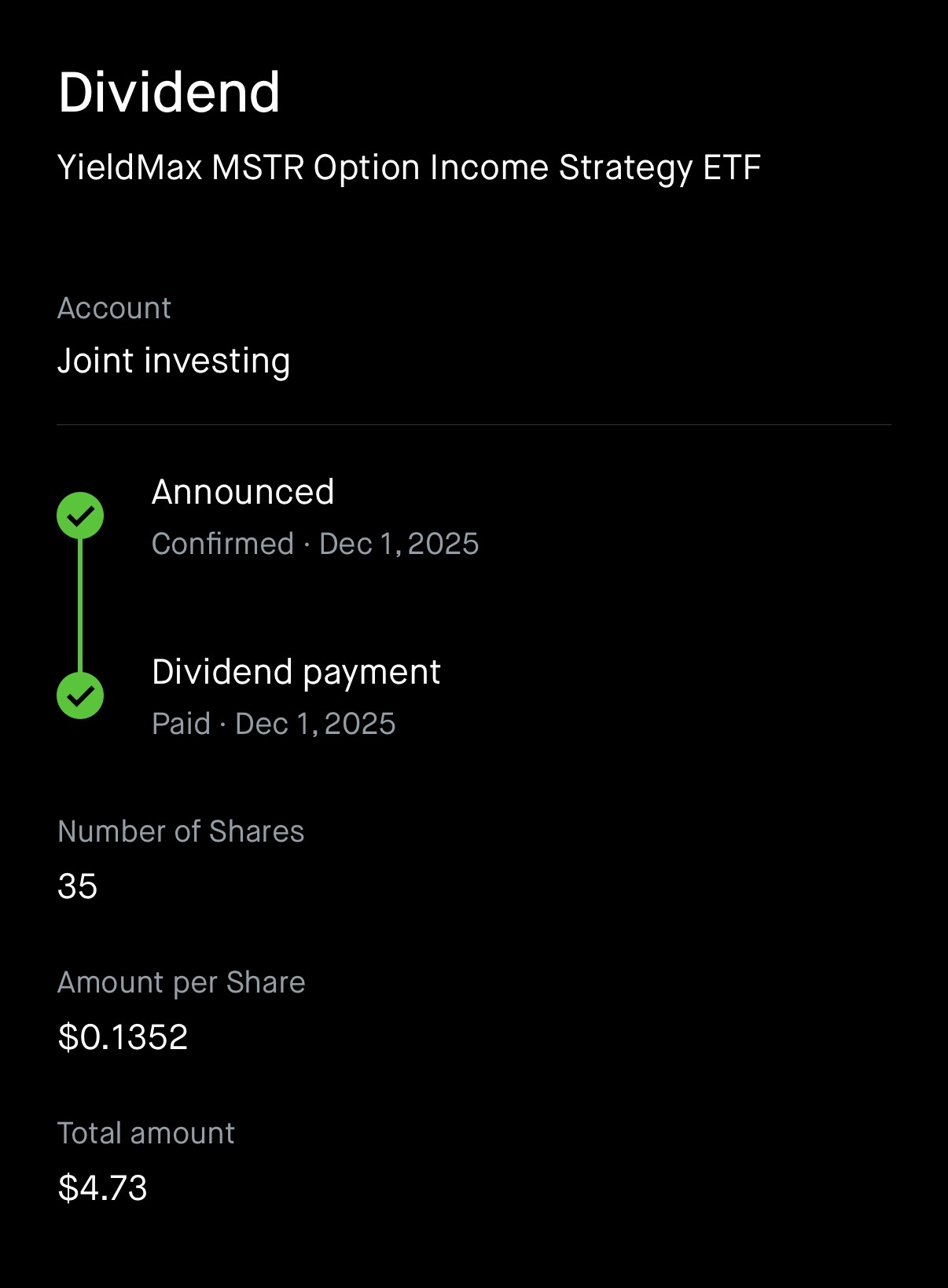 Which is good for a total of 5,066 sats! for owning 35 shares.