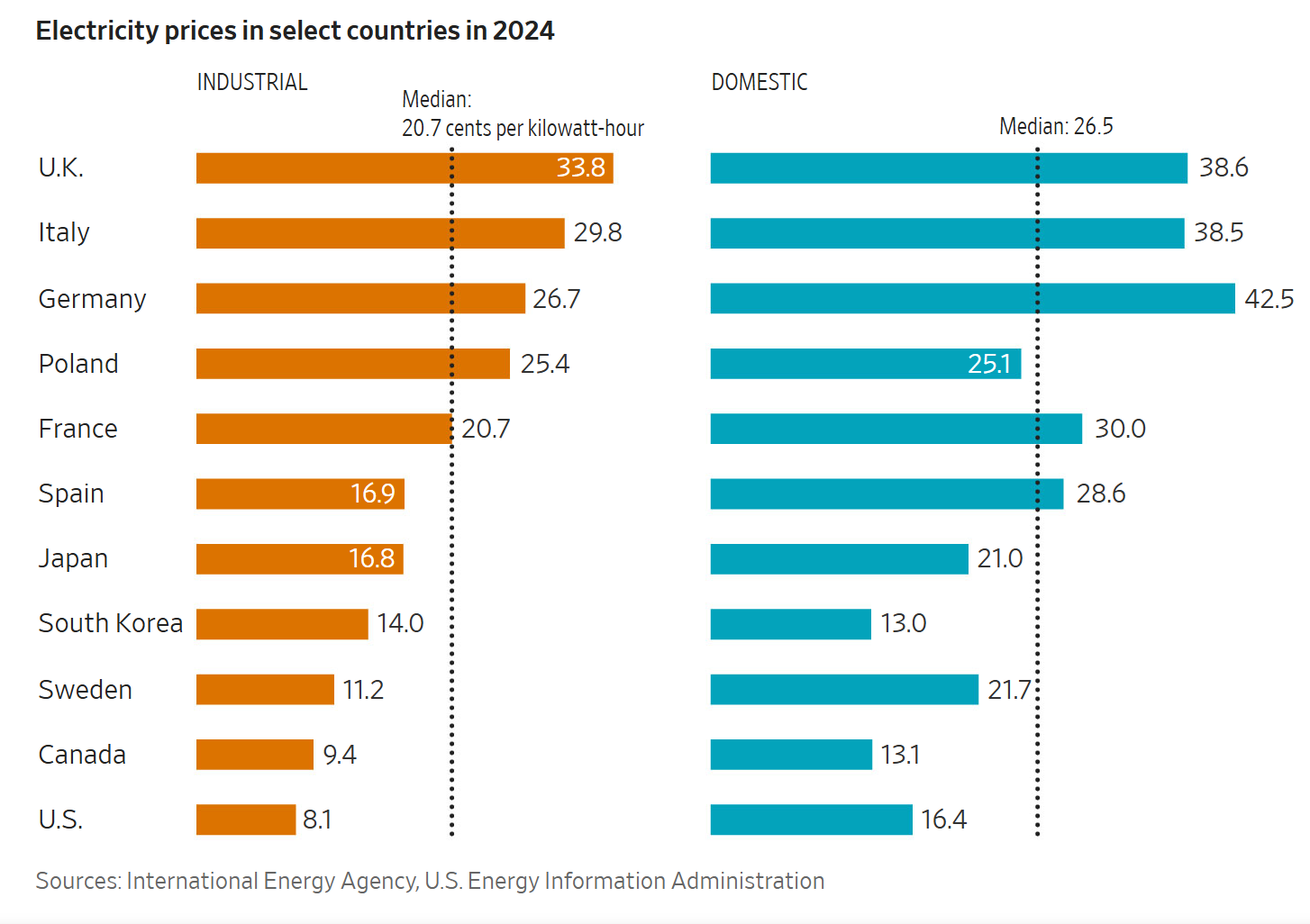 Germany now has the highest domestic electricity prices in the developed world, while the U.K. has the highest industrial electricity rates, according to a basket of 28 major economies analyzed by the International Energy Agency. Italy isn’t far behind. Average electricity prices for heavy industries in the European Union remain roughly twice those in the U.S. and 50% above China.
