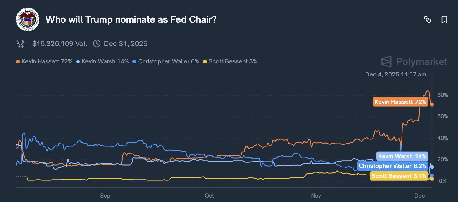 Today, the favorite to take over the Fed is Kevin Hassett, with a 72% probability according to Polymarket. The second-placed candidate has only 14%. This is not opinion; it's the market pricing in the candidate. And this difference increases every week.