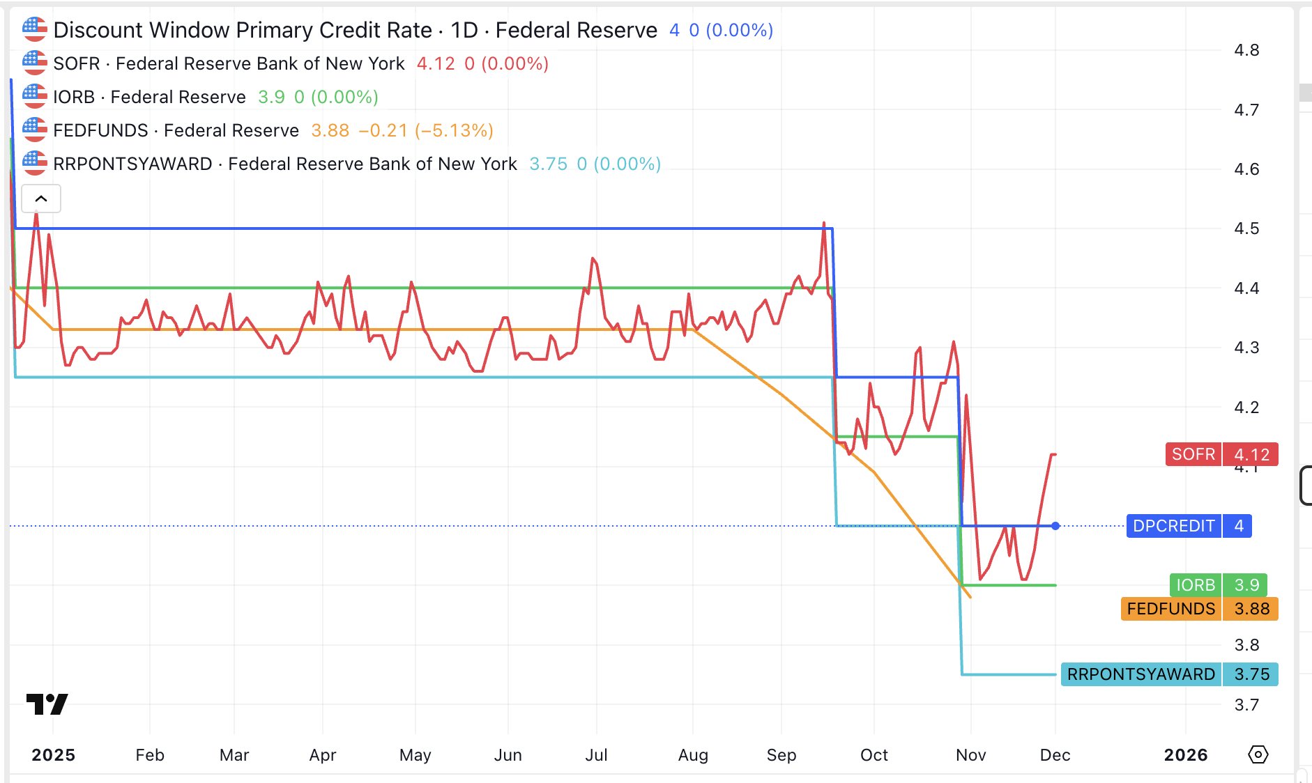 At the same time, the financial system is crying out for help. The SOFR, the central repos market rate, has been above the Fed's desired limit for days, reaching 4.12%, while the ceiling is 4%.