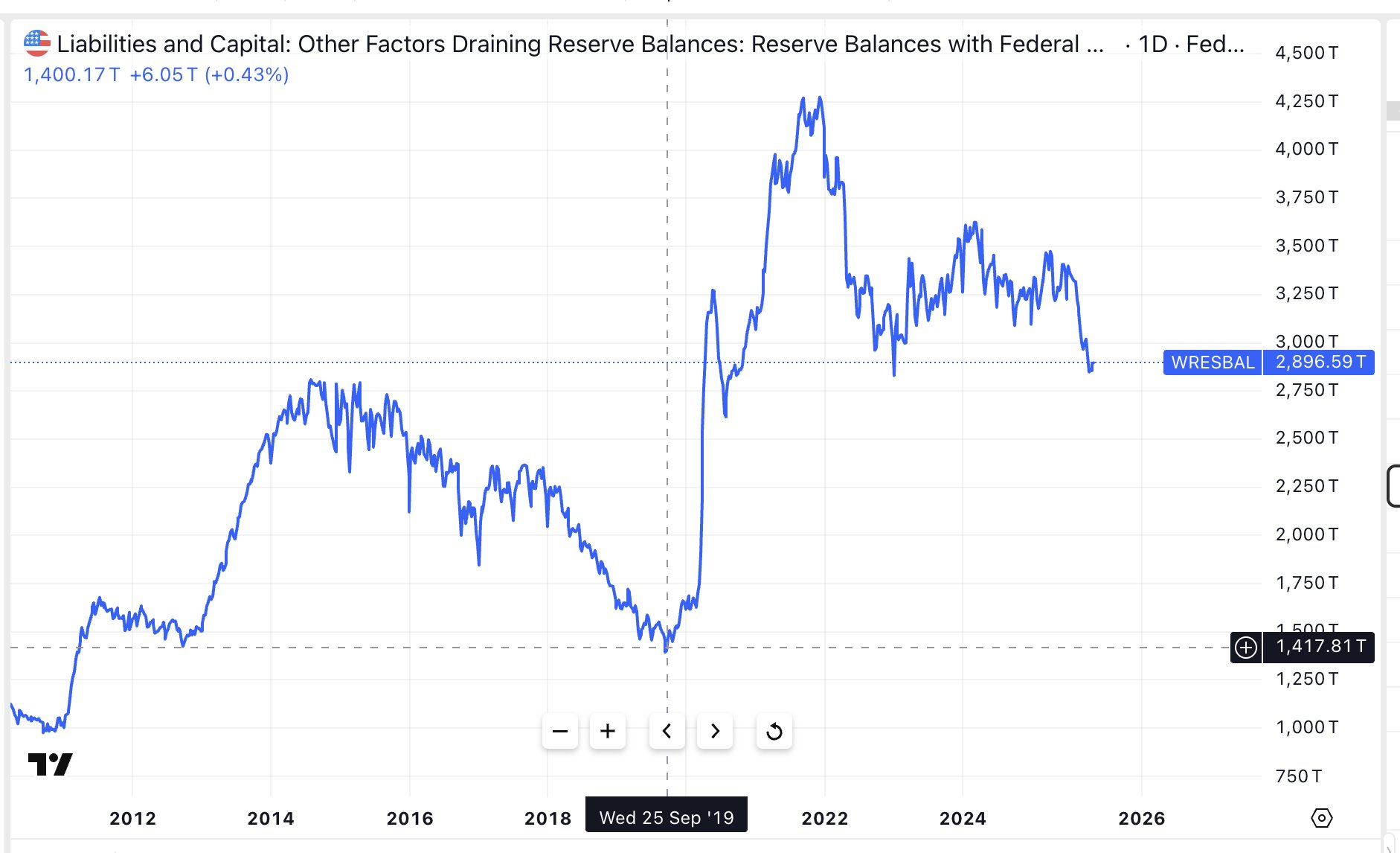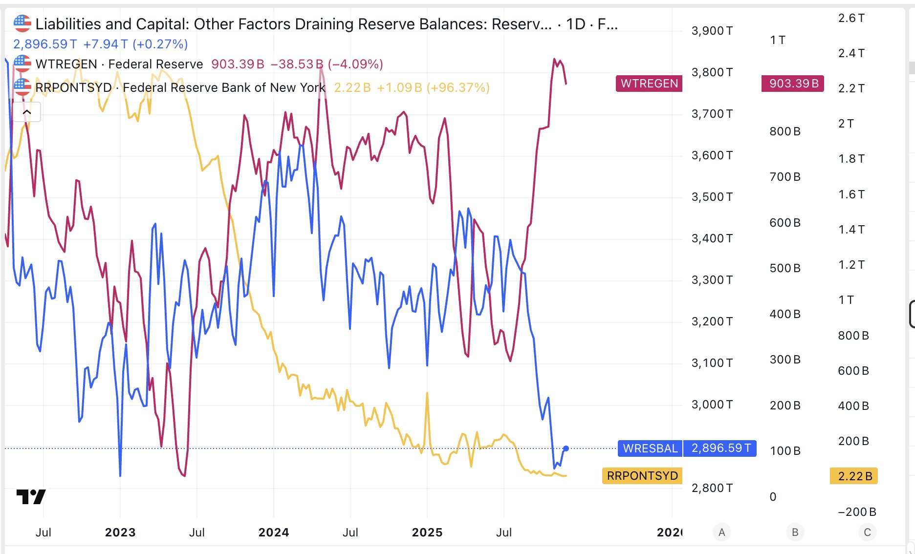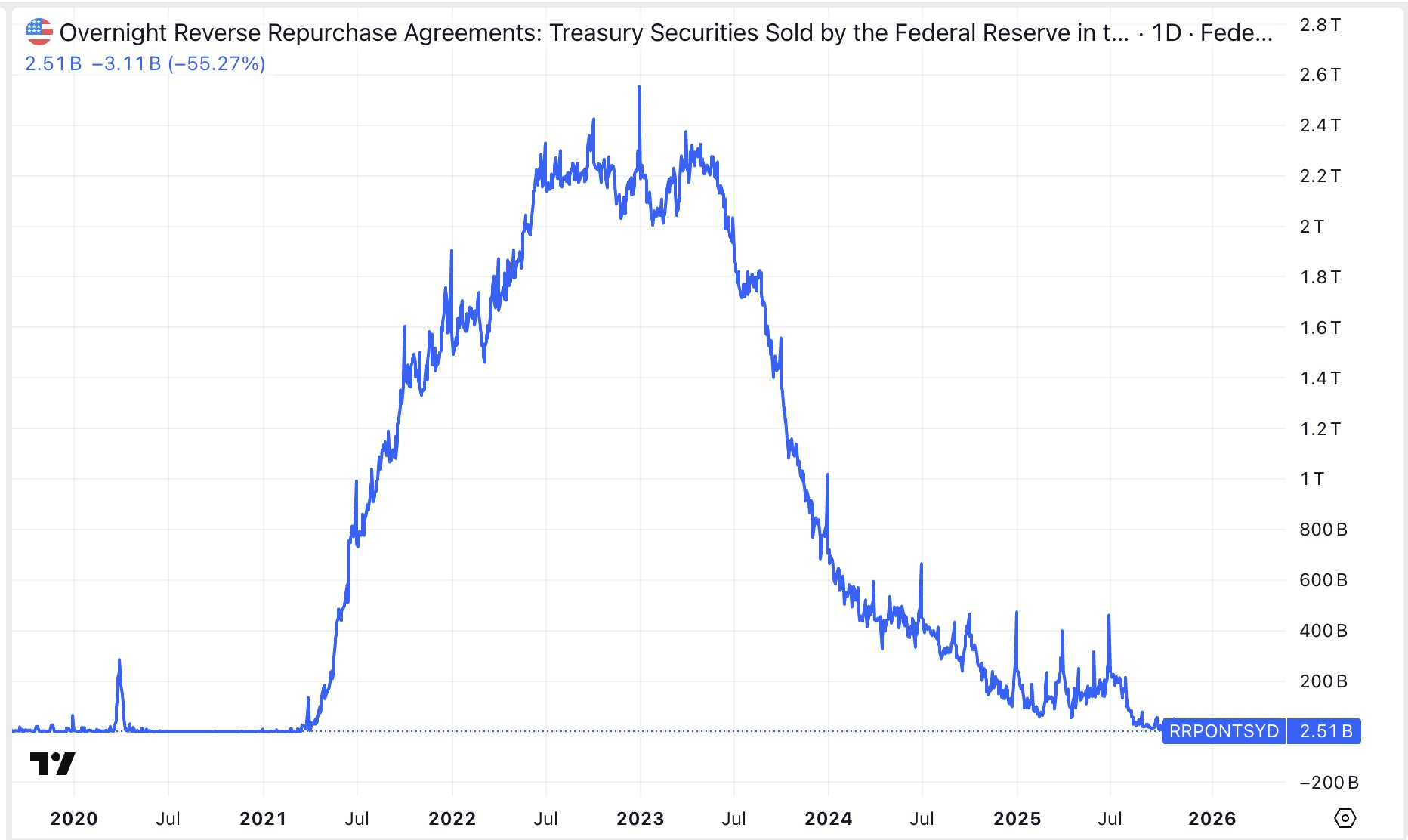And the main reservoir of excess liquidity simply dried up. In 2022, Reverse Repo held 2.5 trillion. Today, less than 3 billion remain.