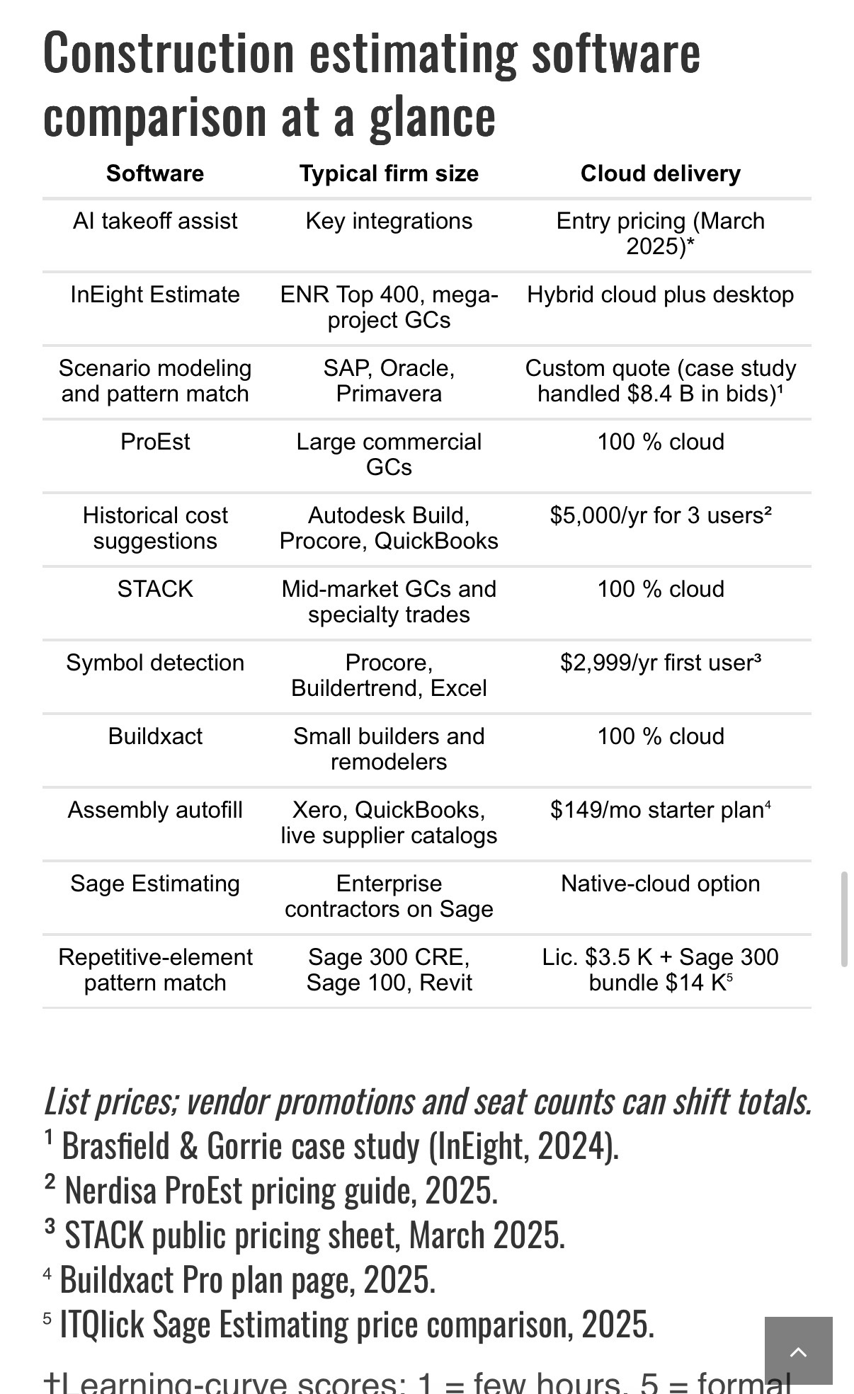 Sage Estimating feels less like new software and more like the finance module you were missing. Why it clicks Timberline lineage. The product descends from Timberline, a name veterans still respect for disciplined cost control. Deep cost databases. Break an estimate down to phase, cost code, or sub-item, then send the numbers straight to the general ledger with one click. Native-cloud upgrades. The June 2024 release added Sage BidMatrix for bid leveling and real-time team collaboration. AI-assisted takeoff. Pattern recognition speeds repetitive elements such as hotel rooms or precast panels so estimators focus on strategy. Enterprise audit trail. Network lock-and-merge plus user timestamps satisfy owner and DOT reviews. Pricing snapshot (2025) Base license: about $3,500 Sage 300 CRE integration bundle: around $14,000 per seat Implementation and training: $10,000–$25,000 through certified Sage consultantsConclusion