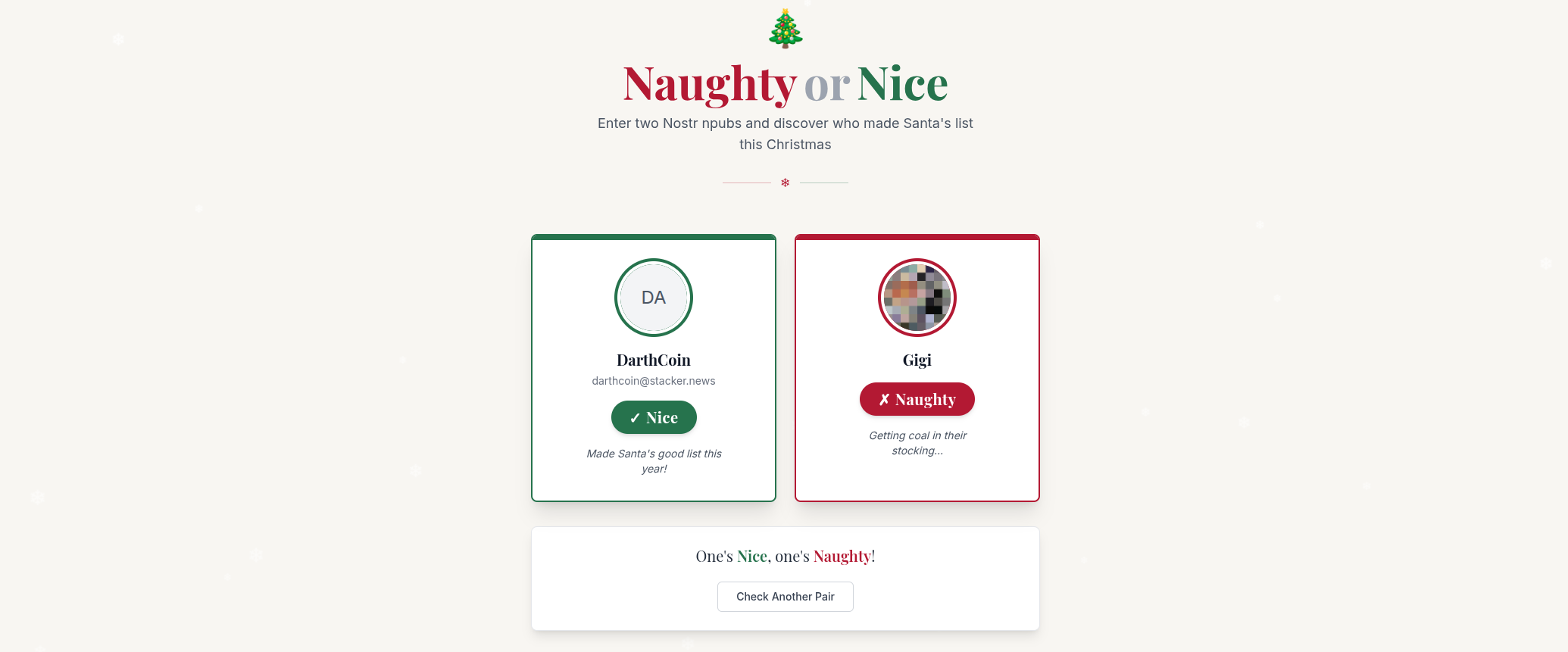 I'm not entirely sure what is going on here, but you can put in two npubs and it seems to evaluate them for Santa's naughty or nice list... Here is the yin and yang of Bitcoin. Results are surprising?