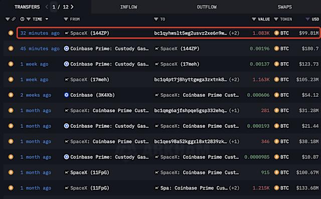 SpaceX moved almost $100 million in Bitcoin to a new wallet rather than to the wallets in the previous transfers, on-chain analyst Lookonchain reported on December 5. The on-chain expert believes the latest transfer to Coinbase Prime is likely for custody purposes. Arkham transaction data revealed over 1083 BTC moved from the wallet linked to SpaceX. Unspent 283 BTC worth $31.33 moved to ‘bc1qrzg’ and spent $162.48 in BTC moved to Coinbase Prime. Also, the remaining unspent 800 BTC worth $73.73 million moved to ‘bc1qyh’ wallet. SpaceX primary wallet still sits on 5,012 BTC, valued at $461.7 million at the current market price. Transfers look like a pattern as SpaceX rotates part of its Bitcoin holdings into fresh wallets every few weeks. Notably, coins moved to new addresses in the last two months remain untouched.