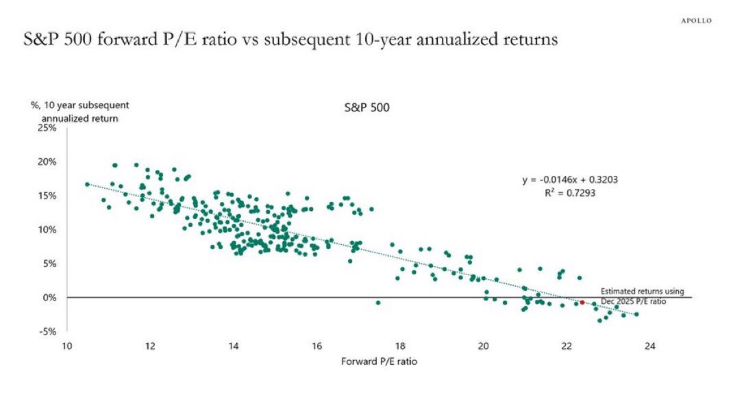 Apollo's chart is an unsettling reminder: the historical relationship between the S&P 500's forward P/E ratio and the annualized return over the next 10 years points to a real risk of near-zero returns in the next decade if current multiples persist.
