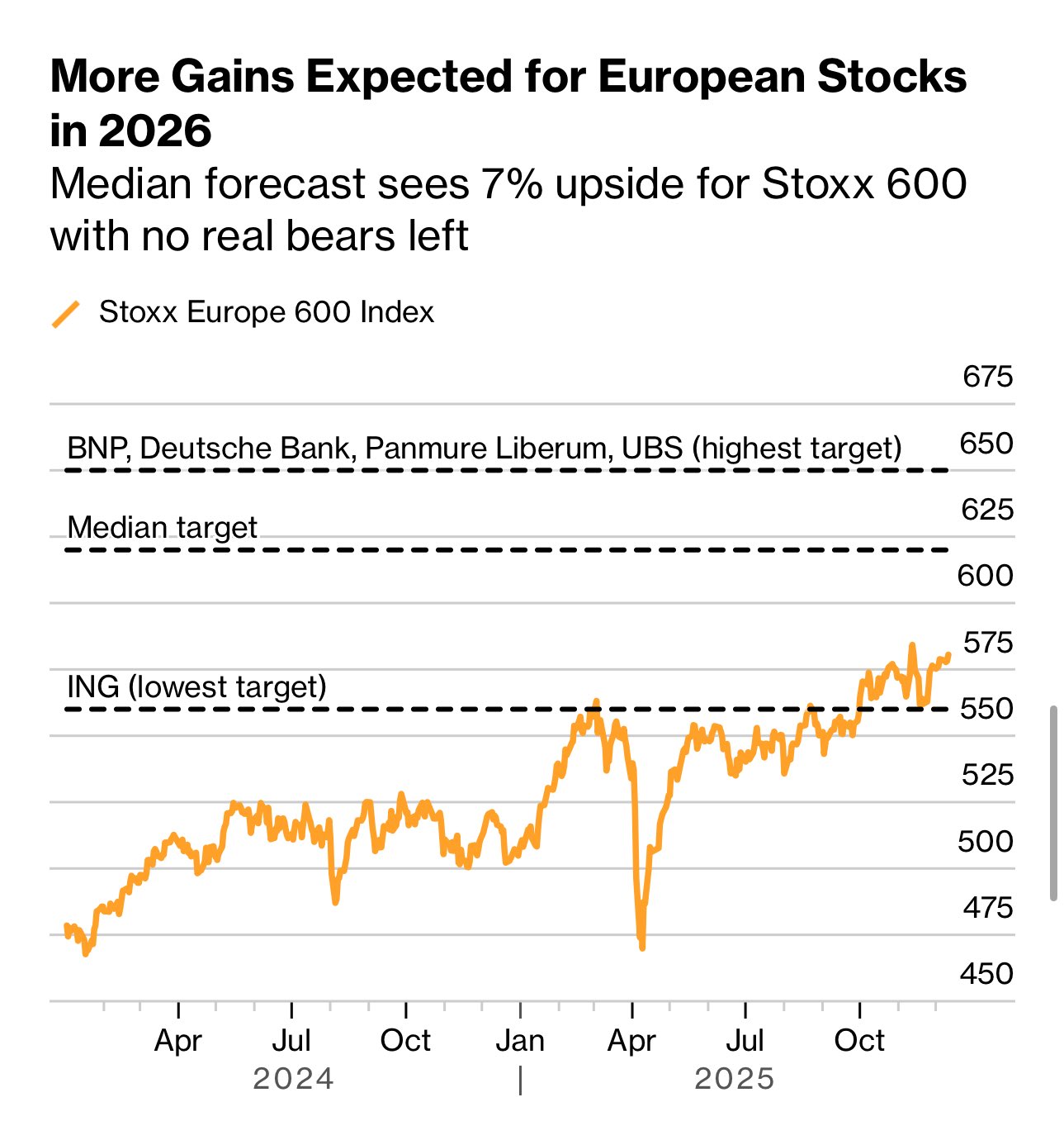 The consensus among global strategists remains constructive. The S&P 500 is projected to reach near 7,600 points in 2026, and virtually no major banks in Europe are expecting a significant decline.