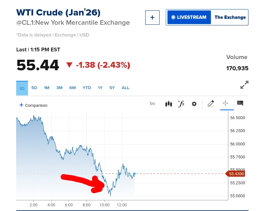 West Texas Intermediate hit a low of $54.98 per barrel, the lowest level since Feb. 3, 2021. The U.S. benchmark was last trading 2.36% lower at $55.48, while Brent was at $59.13, down 2.36%.