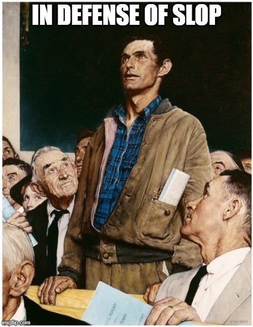 I agree with Crawford's opinion of slop here: yes, it is largely pointless and unpleasant, but so were many blogs. The fact that most people will use a tool badly to produce uninteresting products is not a reason to fear the tool, especially because there will be some people who use the tool to create wonderful things.