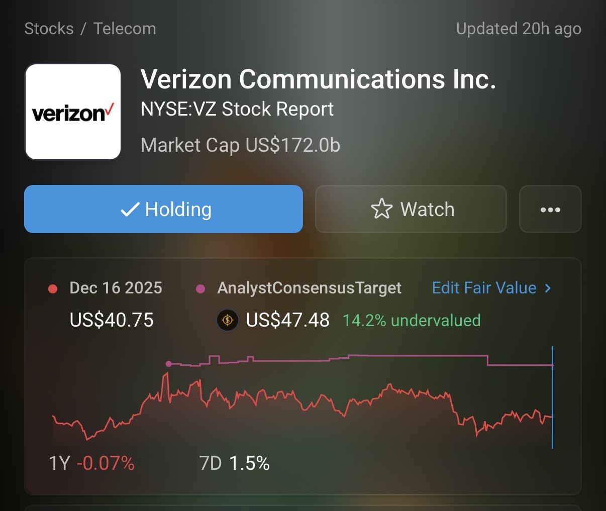 Verizon, despite its terrible balance sheet where its debt exceeds its market capitalization, is a sold business. Their conference calls and 10k reveal that the majority of their debt stems from tower and fiber optic construction, as well as purchasing frequency spectrums from the FCC.