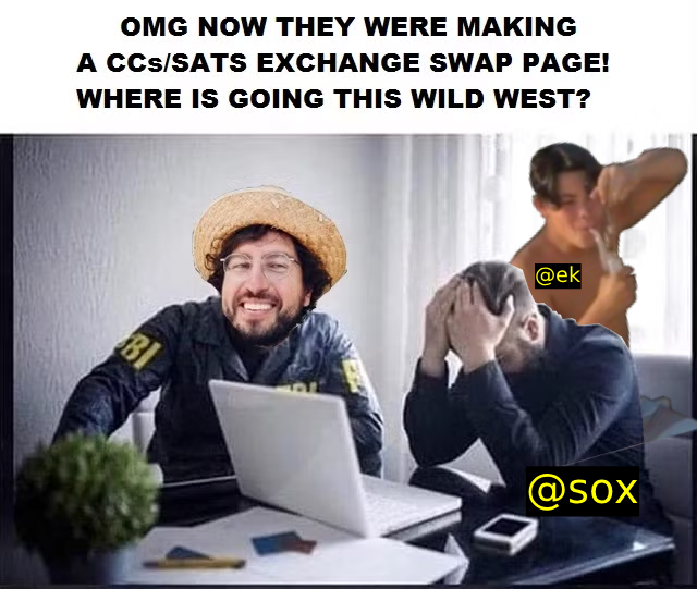 This exchange is strictly for stackers that are in need of CCs to pay inside SN posts, comments, territories etc or stackers that have more CCs they need and want to swap them for sats. This is not a sale or trading strategy "to get rich", is pure P2P market of a credit used ONLY inside SN.