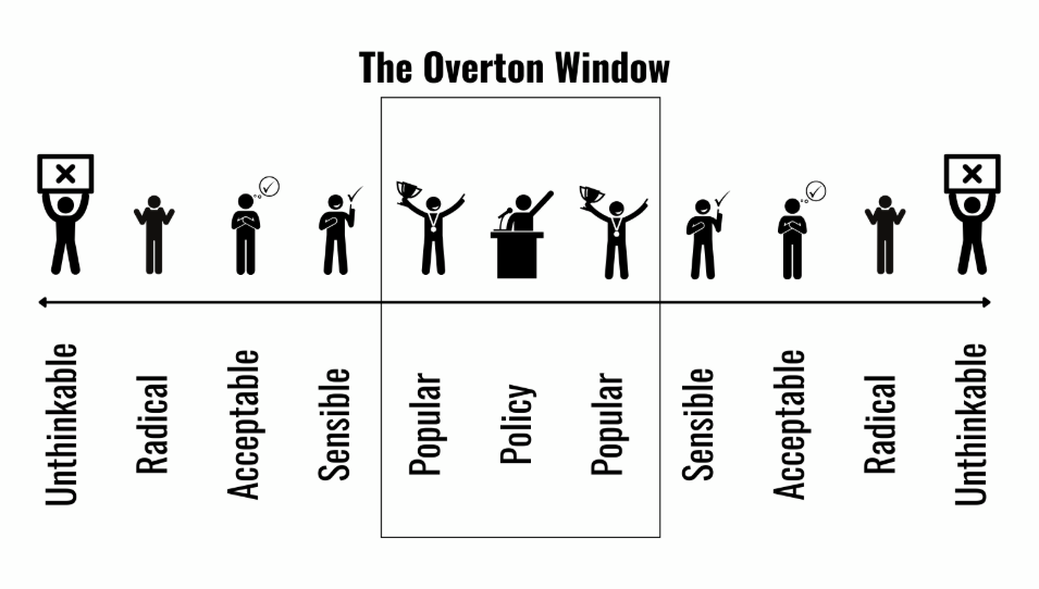 on the surface, there appears to be a wide gap between what's acceptable and unthinkable, yet the Overton Window has been moved back and forth multiple times in the past, and shall continue to be moved, gradually then suddenly, until enough people wake up and start studying & taking action!;