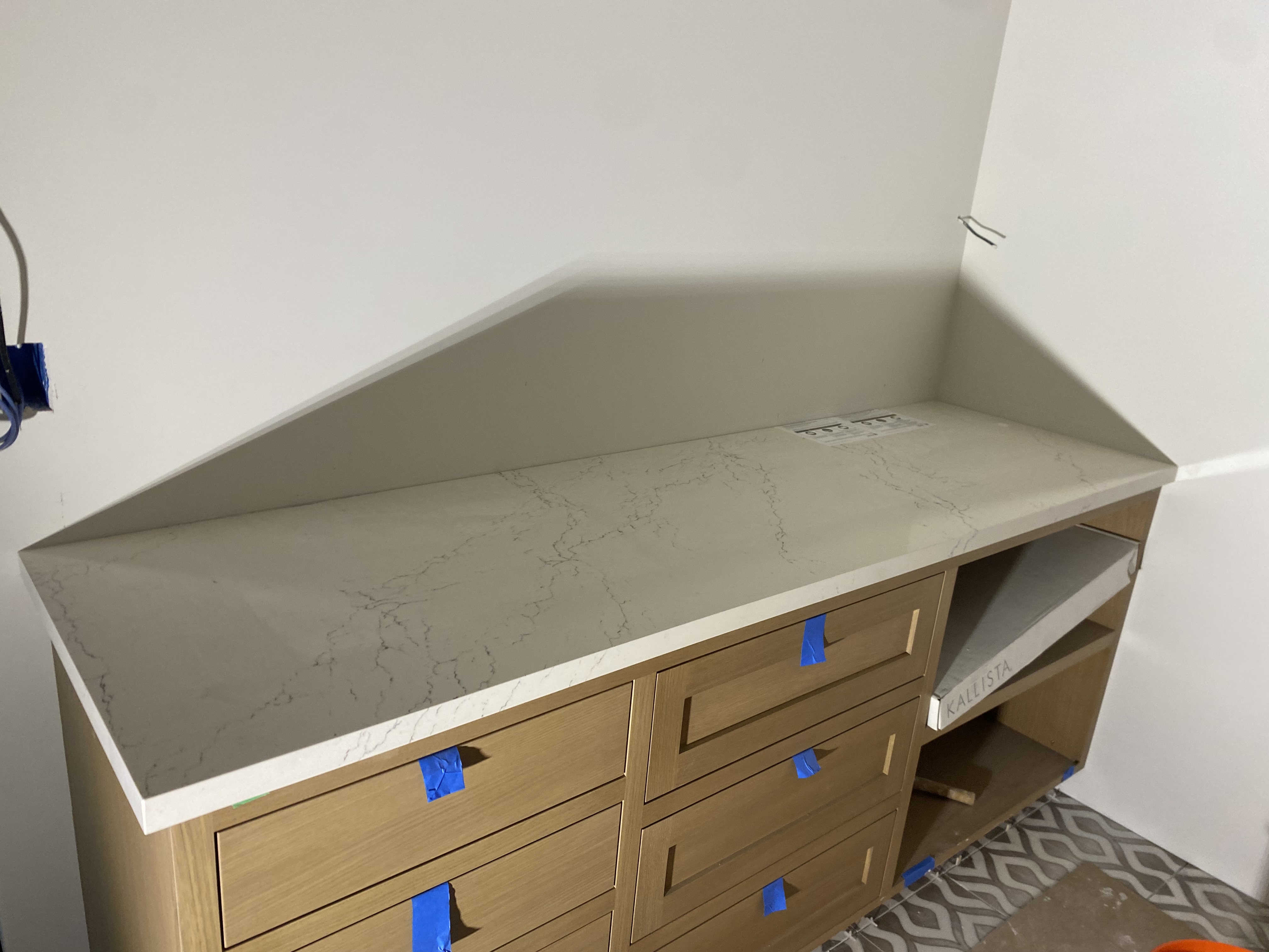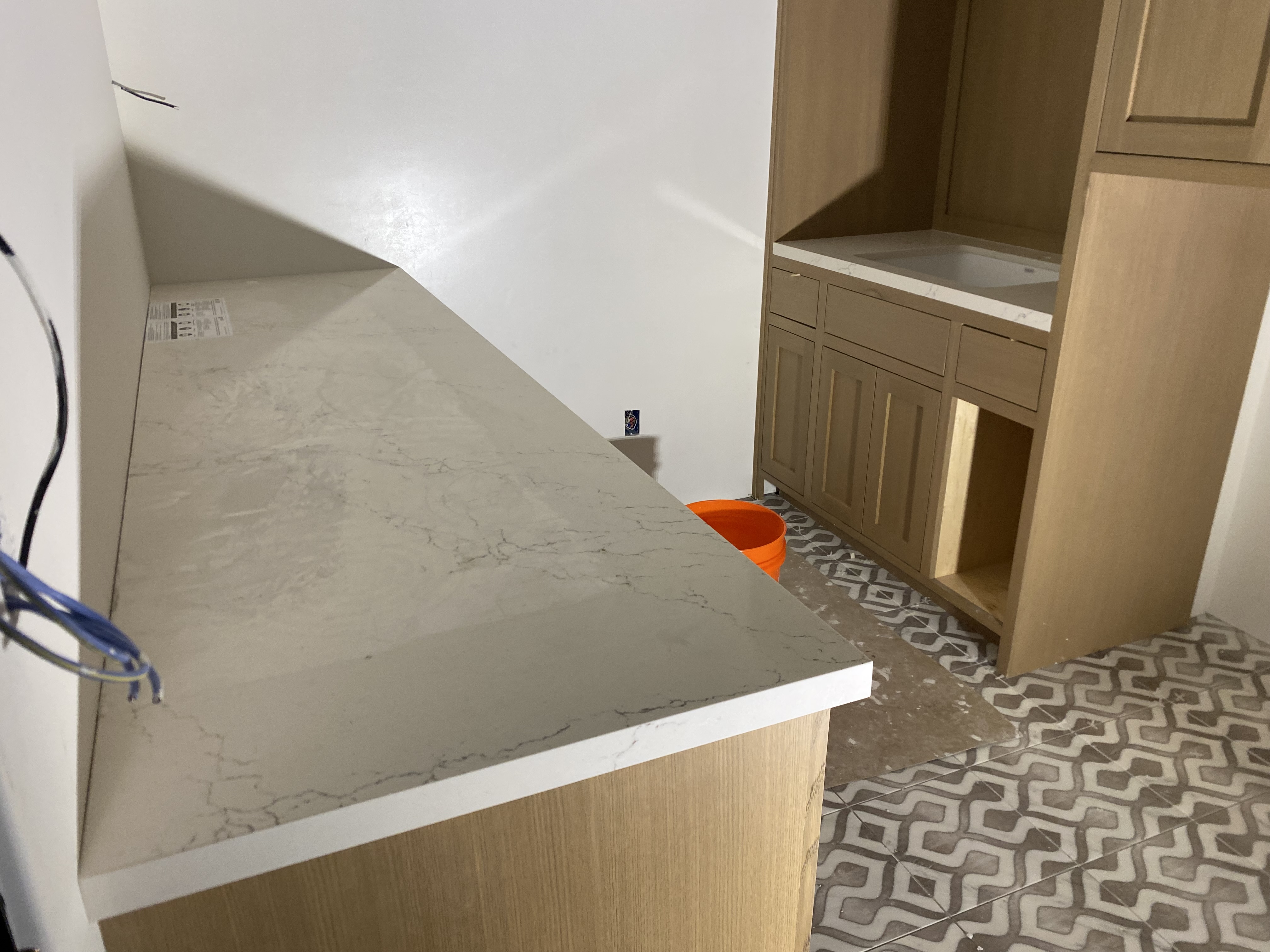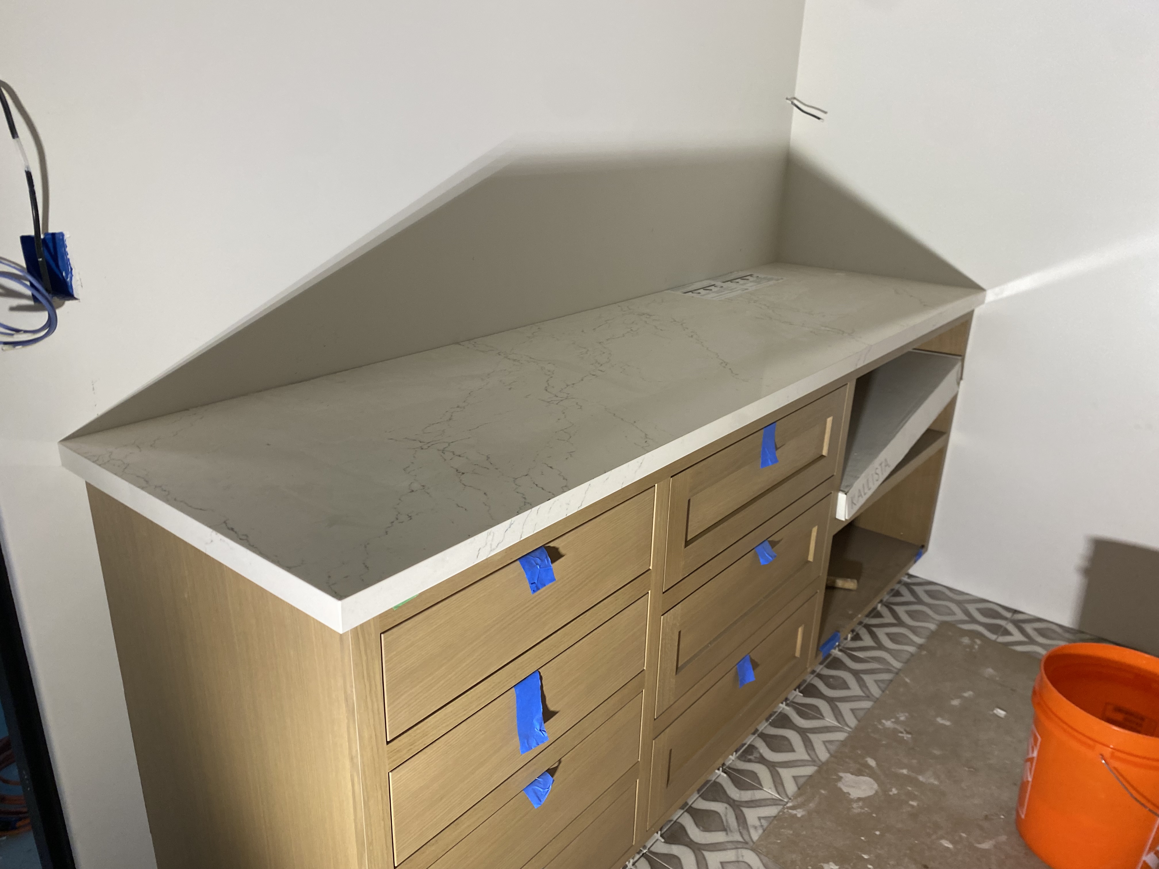 Kitchen countertop with full backsplash (quartz). Laundry room countertops and sink vanity (quartz). Bathroom Vanity (quartz).
