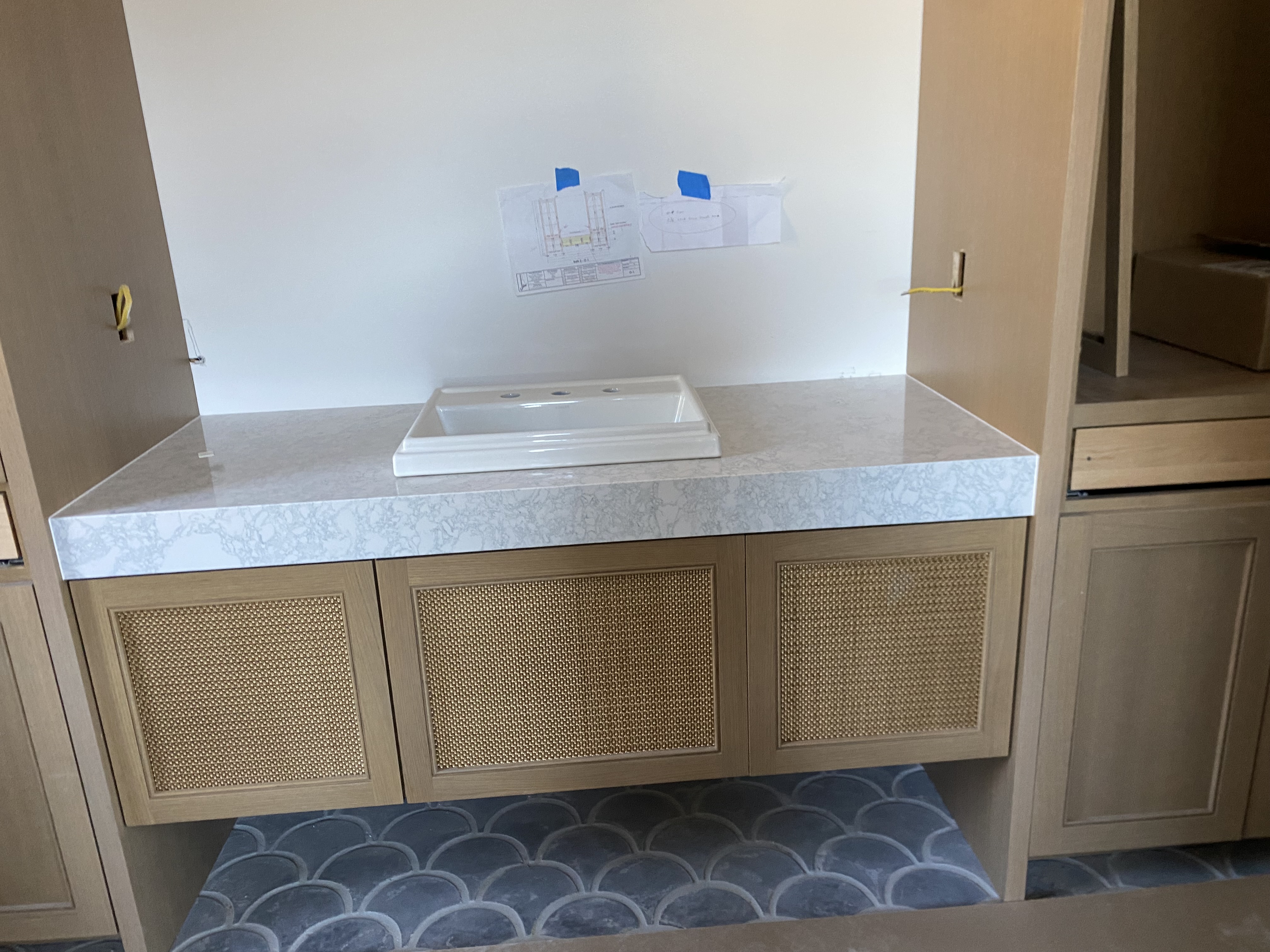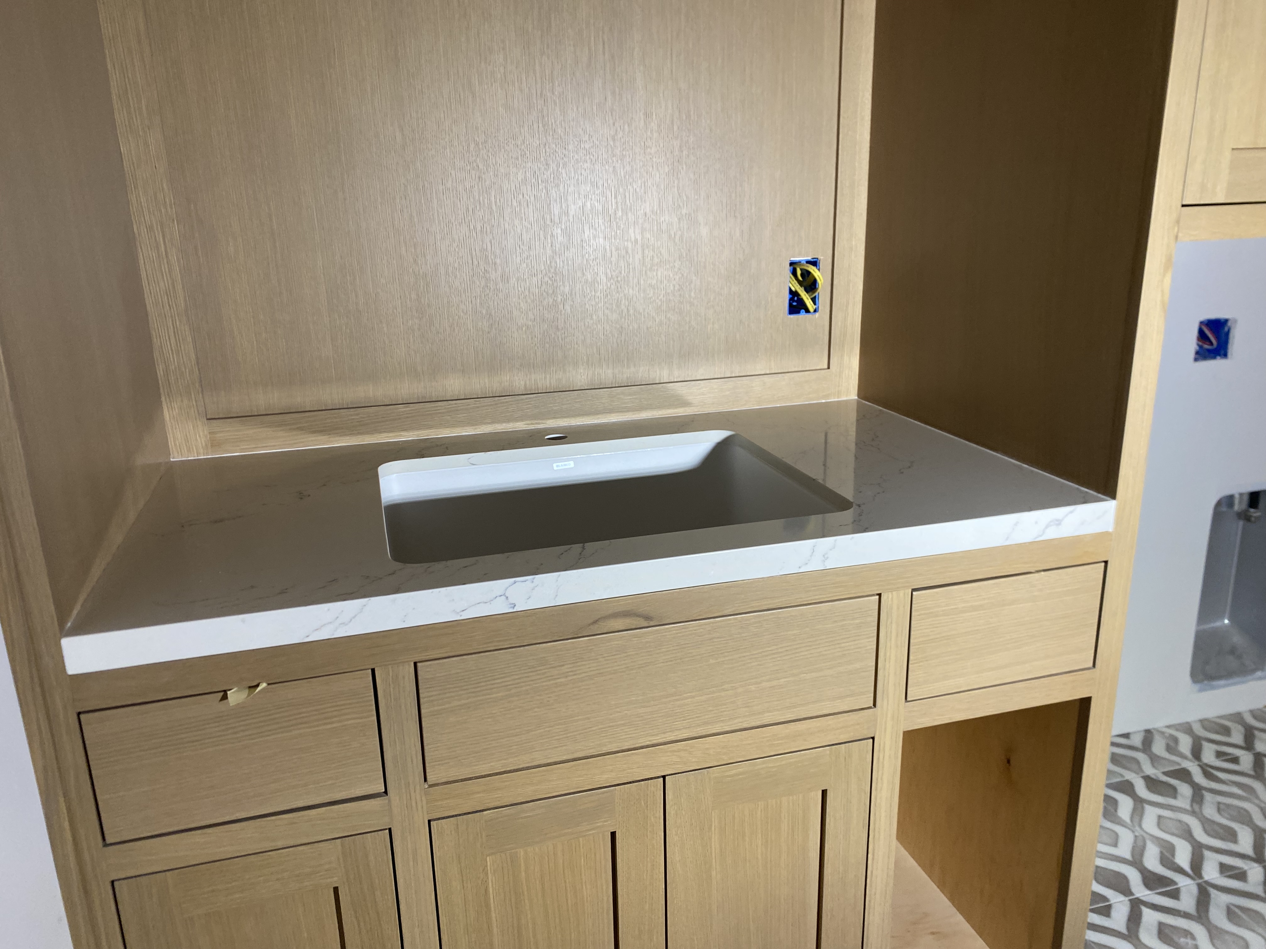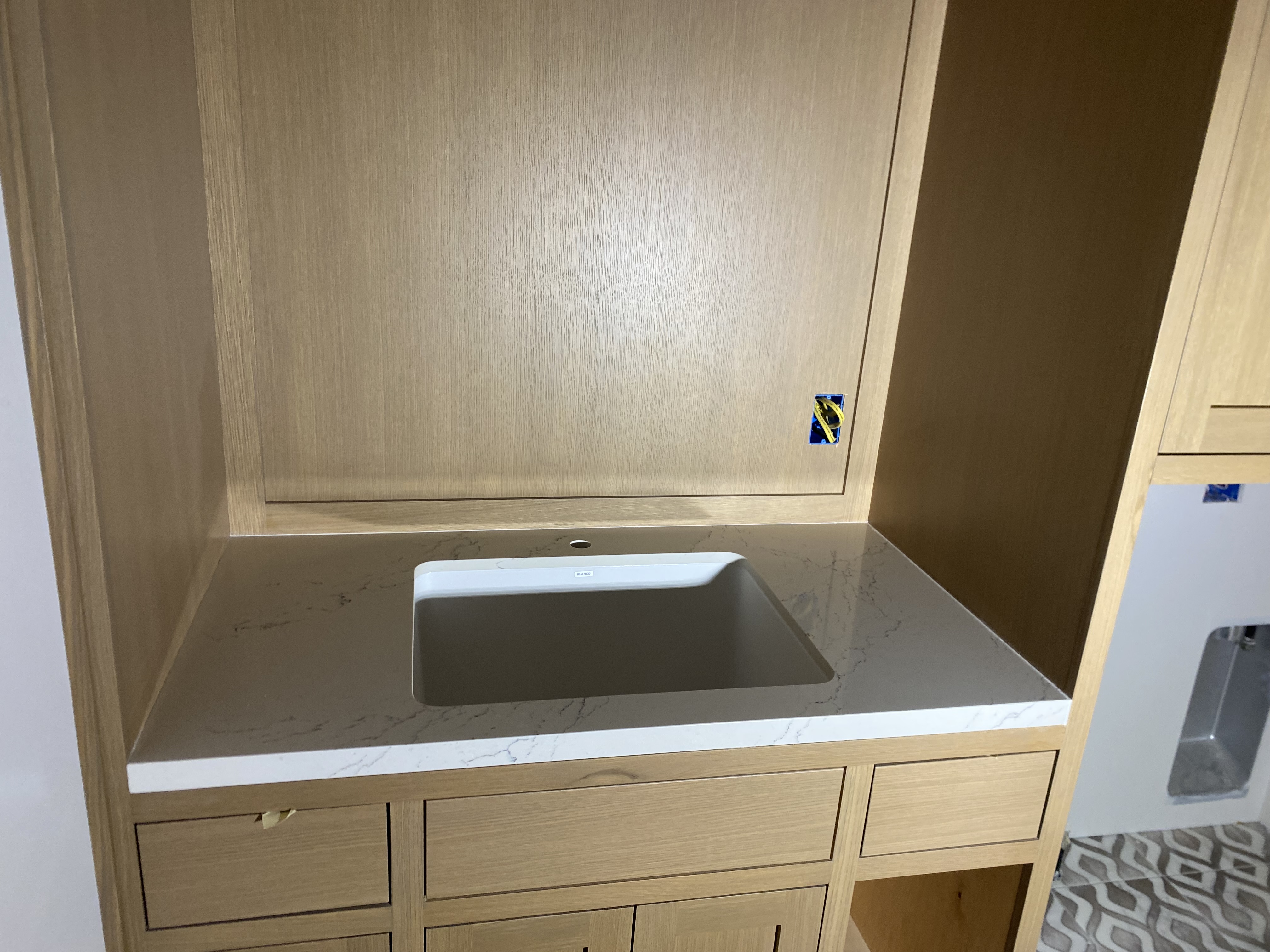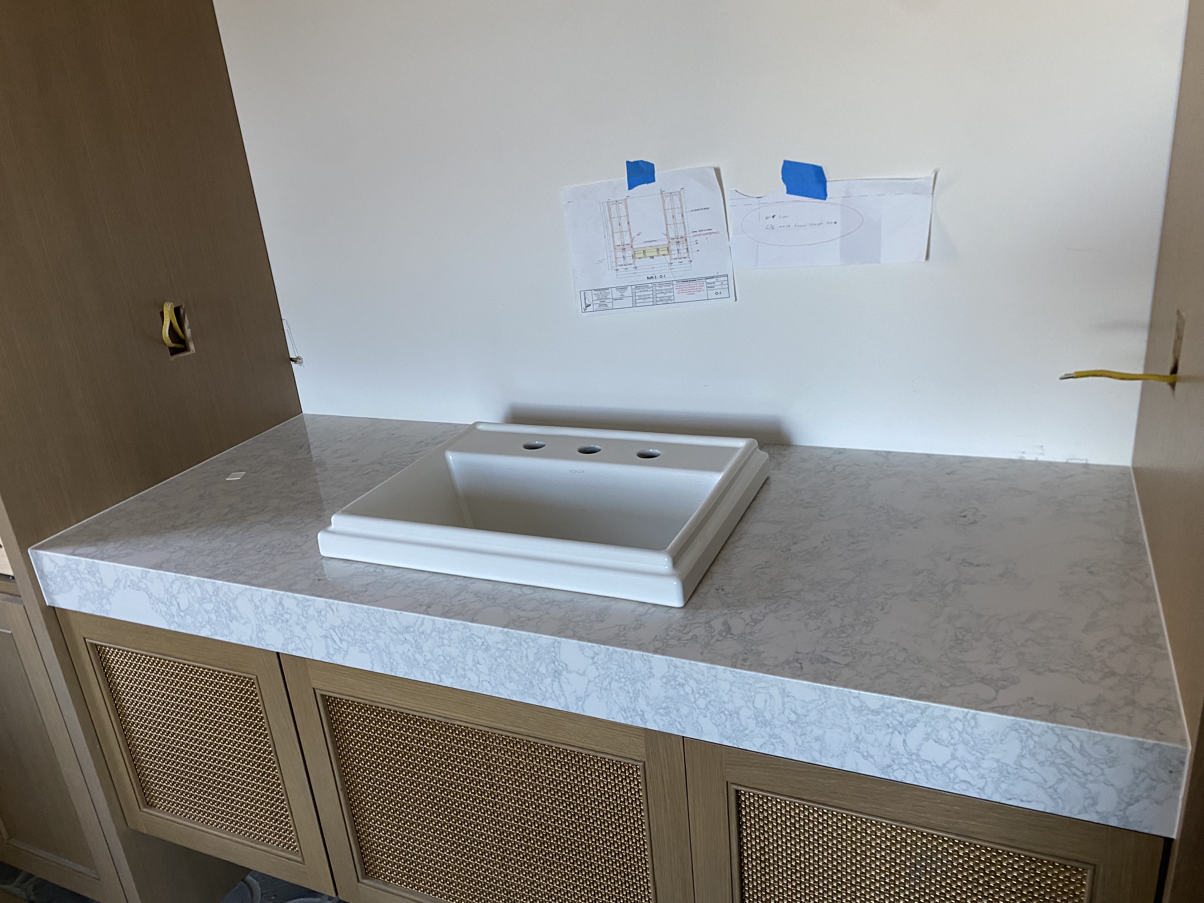 Kitchen countertop with full backsplash (quartz). Laundry room countertops and sink vanity (quartz). Bathroom Vanity (quartz).