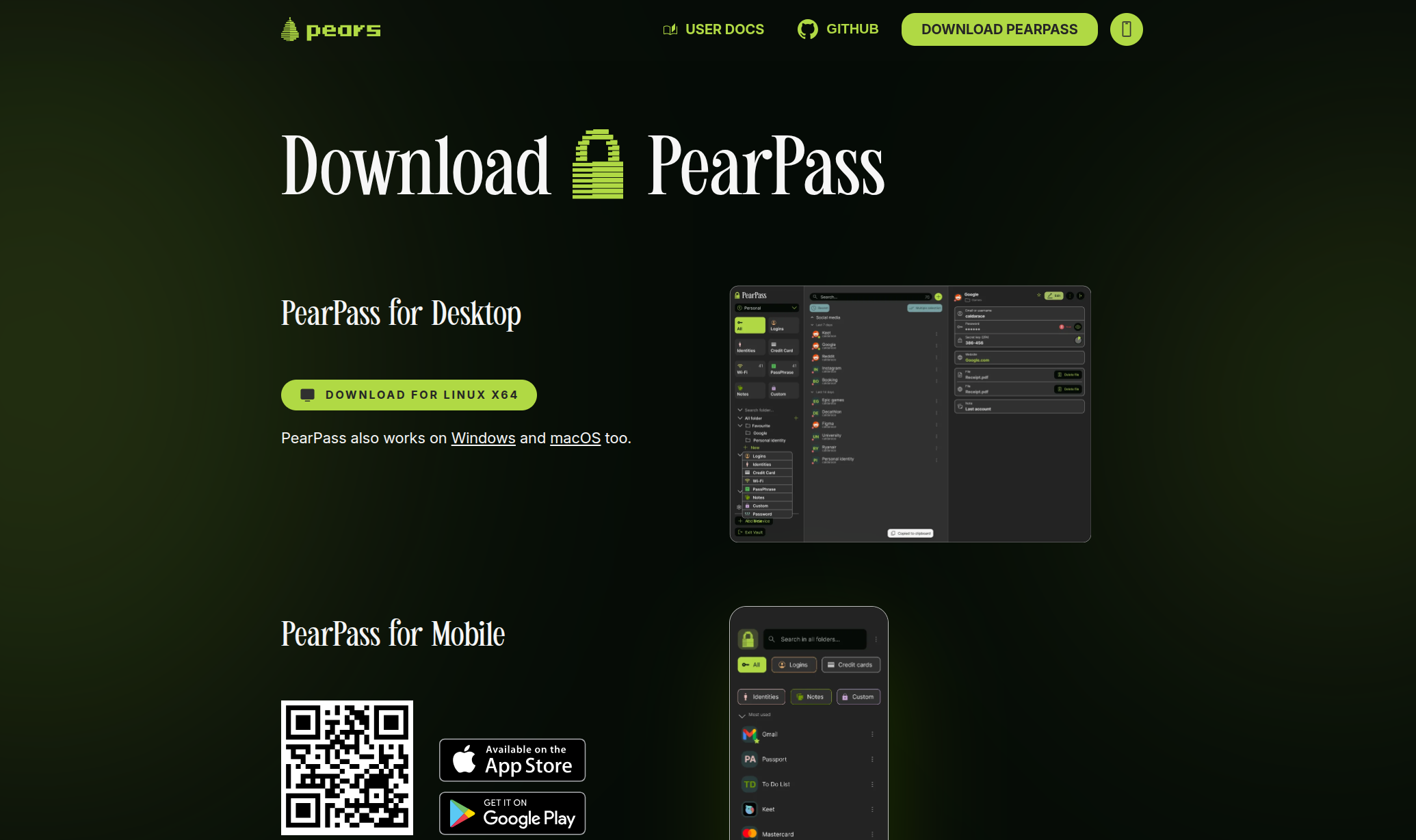PearPass is a distributed password manager powered by Pear Runtime. It allows secure storage of passwords, credit card details, and secure notes, with the ability to distribute data across multiple devices.
