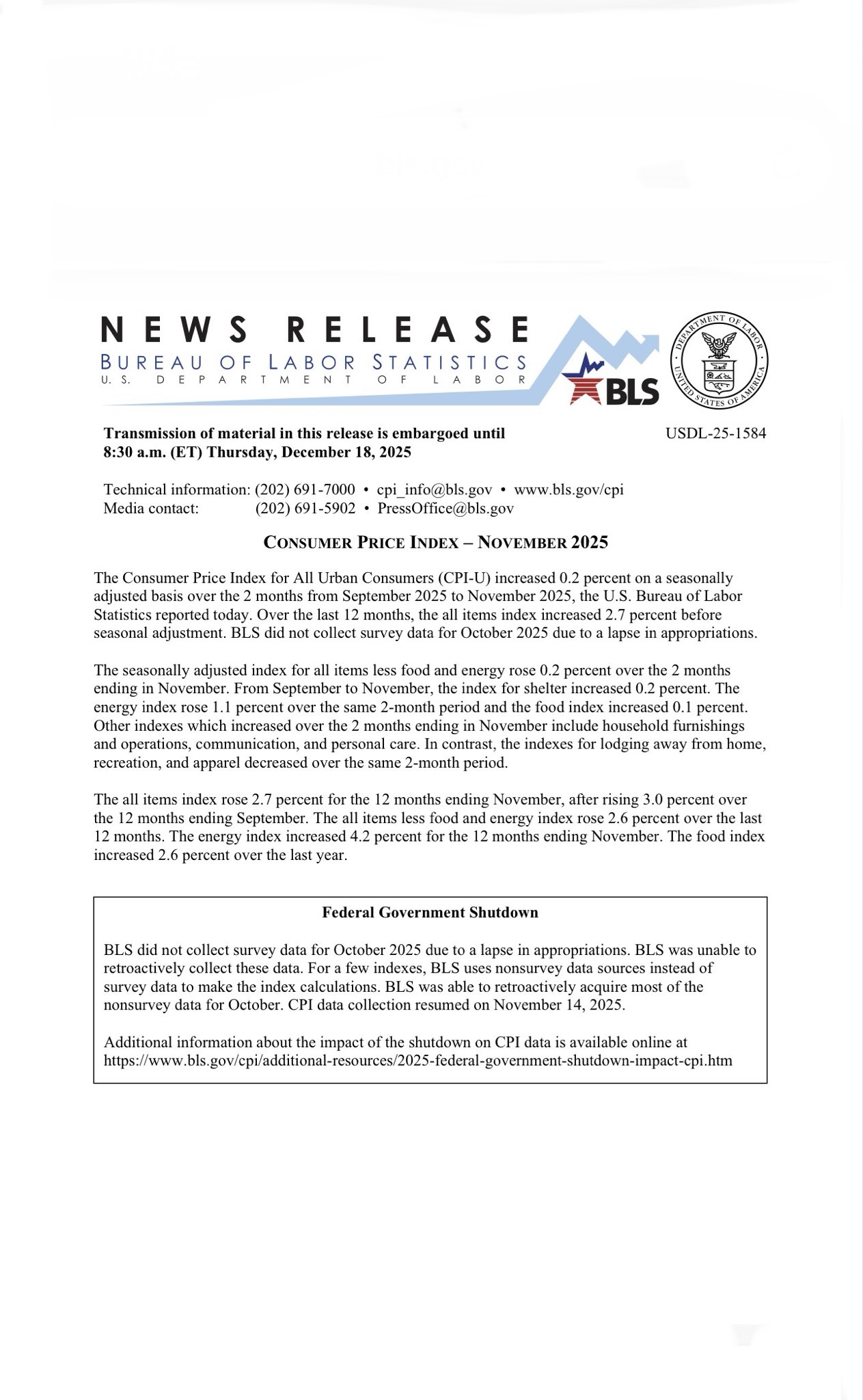 When I read the CPI report, I don’t stop at 2.7% year over year. I try to figure out where inflation still has oxygen and where it’s clearly running out. One footnote matters…October CPI wasn’t collected because of the funding lapse, so we’re leaning on a two month Sept to Nov move with some gaps in the usual monthly detail. Even with that caveat, the signal is clear that headline CPI is 2.7% YoY, core is 2.6% YoY, and the pattern is familiar…cooling into spring, a mid year reacceleration, and now a renewed slowdown.