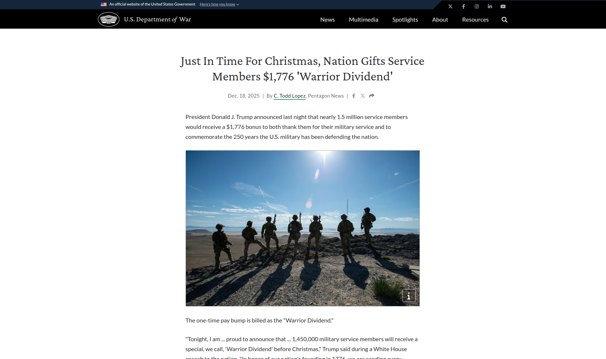 "Tonight, I am ... proud to announce that ... 1,450,000 military service members will receive a special, we call, 'Warrior Dividend' before Christmas," Trump said during a White House speech to the nation. "In honor of our nation's founding in 1776, we are sending every [service member] $1,776."And service members will not wait long to see that dividend, the president said."The checks are already on the way," he said. "Nobody deserves it more than our military, and I say, 'congratulations' to everybody."