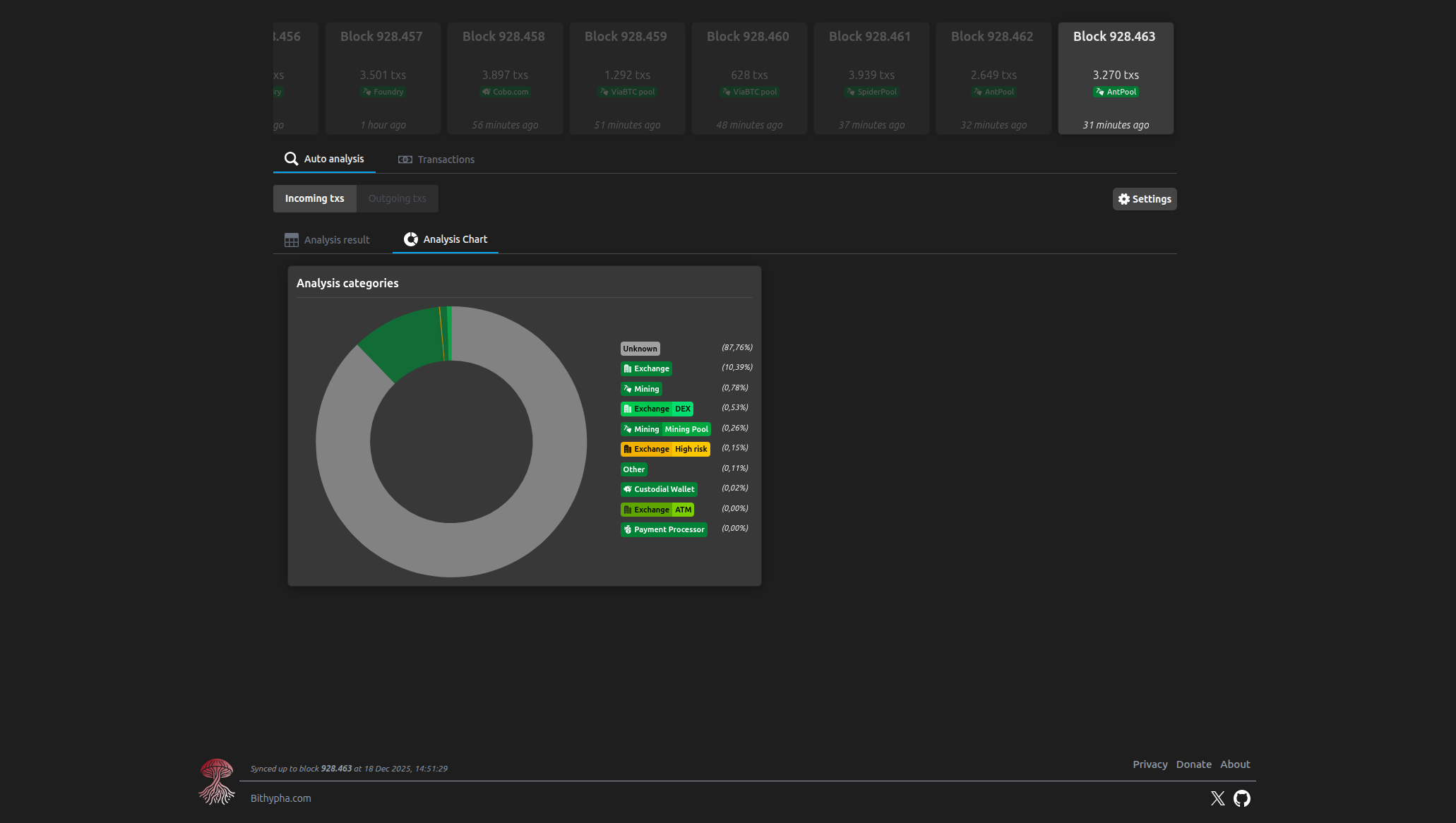 Bithypha is an open and community-driven blockchain analysis tool based in the Netherlands. Our goal is to provide Bitcoin users with a blockchain analysis tool that has the same features you generally only find in paid tools made by large corporations. This way, we aim to empower Bitcoin users and make them aware of the implications and limitations of blockchain analysis tools, giving them insight into what they can do to improve their privacy (sometimes as simple as not reusing their addresses).We would like to focus on building features that you currently only find in paid tools. For example, we recently released a feature to perform an auto-analysis on wallets and addresses, seeing all taint that occurred within a set distance from a wallet or address, this is something you cannot currently do with other open tools. In the upcoming time we will expand on this, allowing you to see all the transactional links between a certain taint and the address or wallet you scanned. We also do our best to give users as much attributions as we can find.