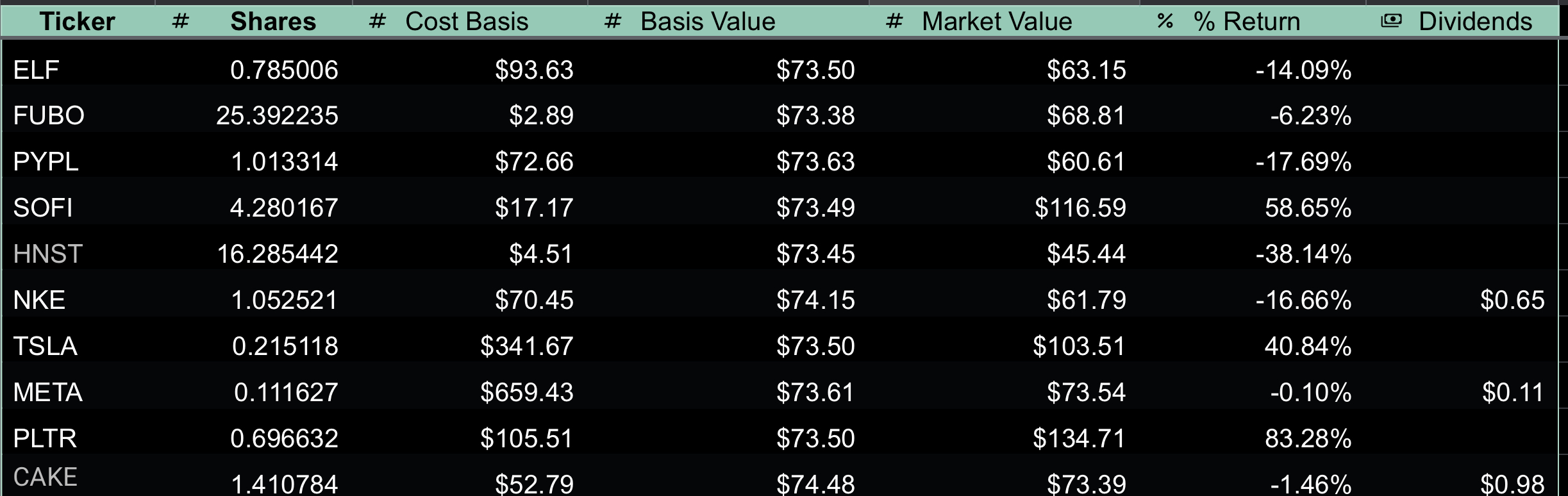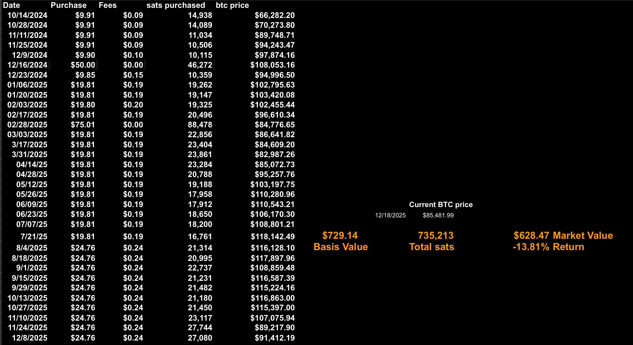 Bitcoin is getting smoked right now by Jeremy’s portfolio but his picks are mostly underwater as well. 2025 is goiing out with a whimper. But this doesn’t matter this is a long term investment experiment. With the DCA going up next month I am excited for what the future can bring.