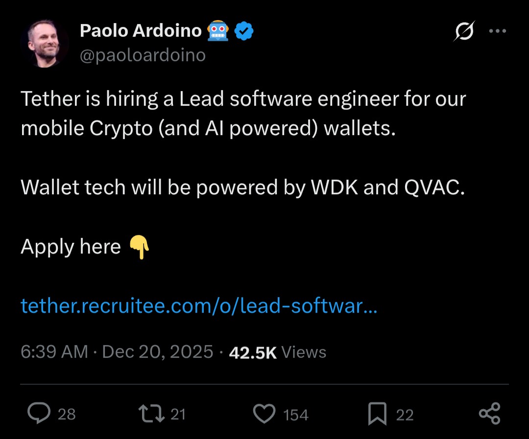 Tether CEO Ardoino posted this job posting for a wllet developer to work on a Bitcoin wallet.