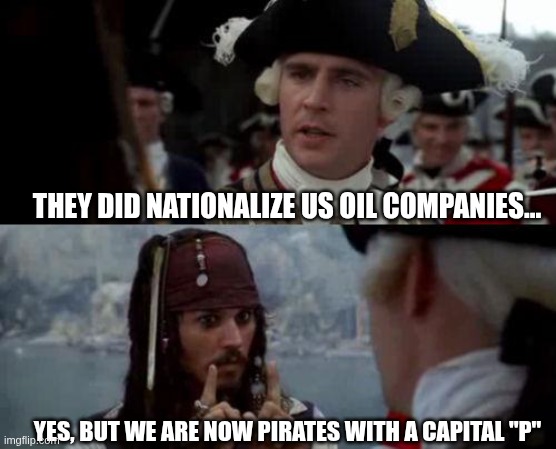 Lol I mean in theory they did Nationalize and take oil from US companies who developed the oil fields for them. Chavez especially nuked the country when he nationalized newer projects and used PDVSA as a piggy bank to fund his programs not letting the company to reinvest thus brining their fields and stations into the utter disrepair they are in today.