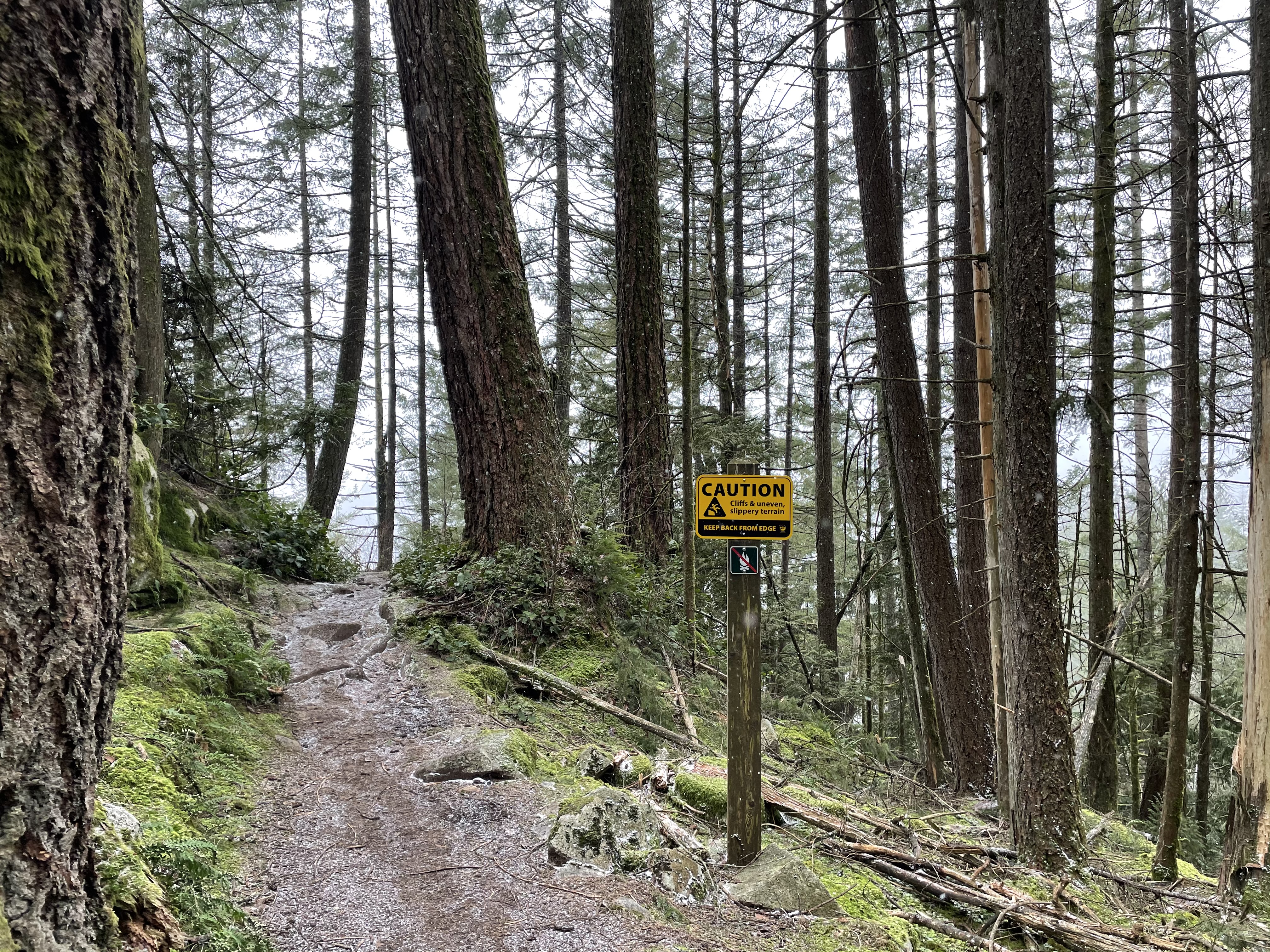 Nearing the Low Knoll viewpoint. Warning sign cautioning hikers to be careful of the cliff.