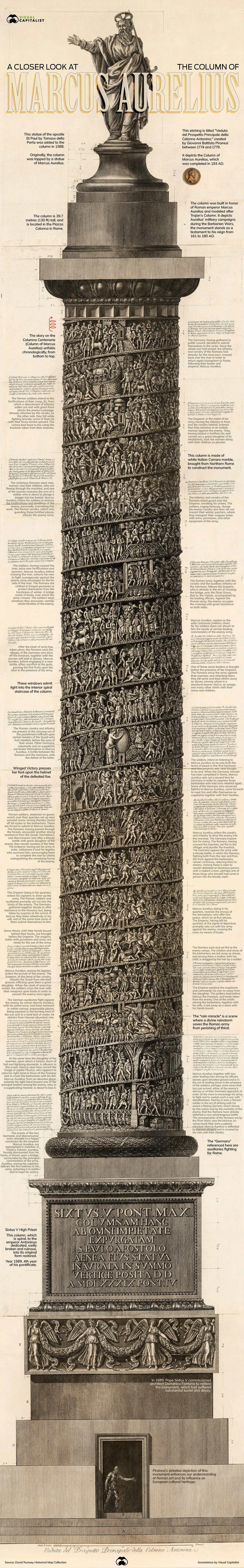 - Standing 39.7 meters (130 feet) tall in Rome’s Piazza Colonna, the column is wrapped in a spiraling frieze that visually narrates Aurelius’ military victories.