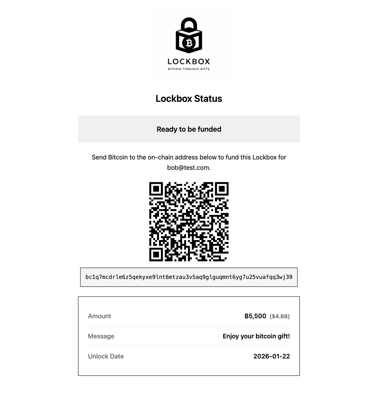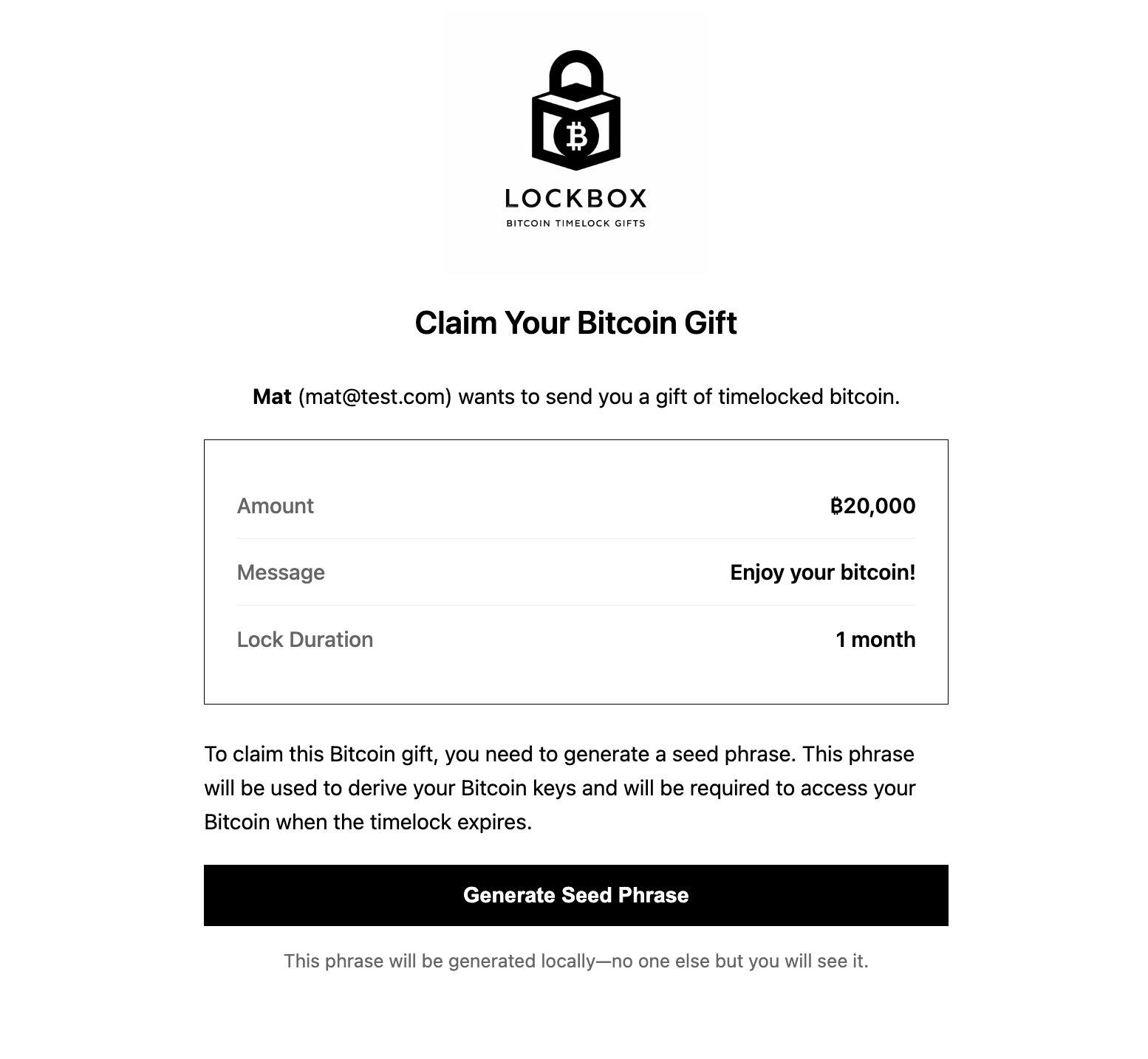 1- Provide recipient email address, duration & amount 2- Recipient gets notified, private key created for them 3- Server gets their xpub, creates a timelock tx for the sender to fund 4- Once funded, the timelocked bitcoin is now the recipient's 5 - Intermittent email notifications remind the recipient about their bitcoin 6- After expiry, recipient provides seed phrase to transfer the coin