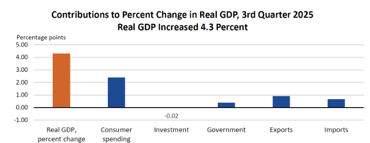 Real gross domestic product (GDP) increased at an annual rate of 4.3 percent in the third quarter of 2025 (July, August, and September), according to the initial estimate released by the U.S. Bureau of Economic Analysis. In the second quarter, real GDP increased 3.8 percent.
