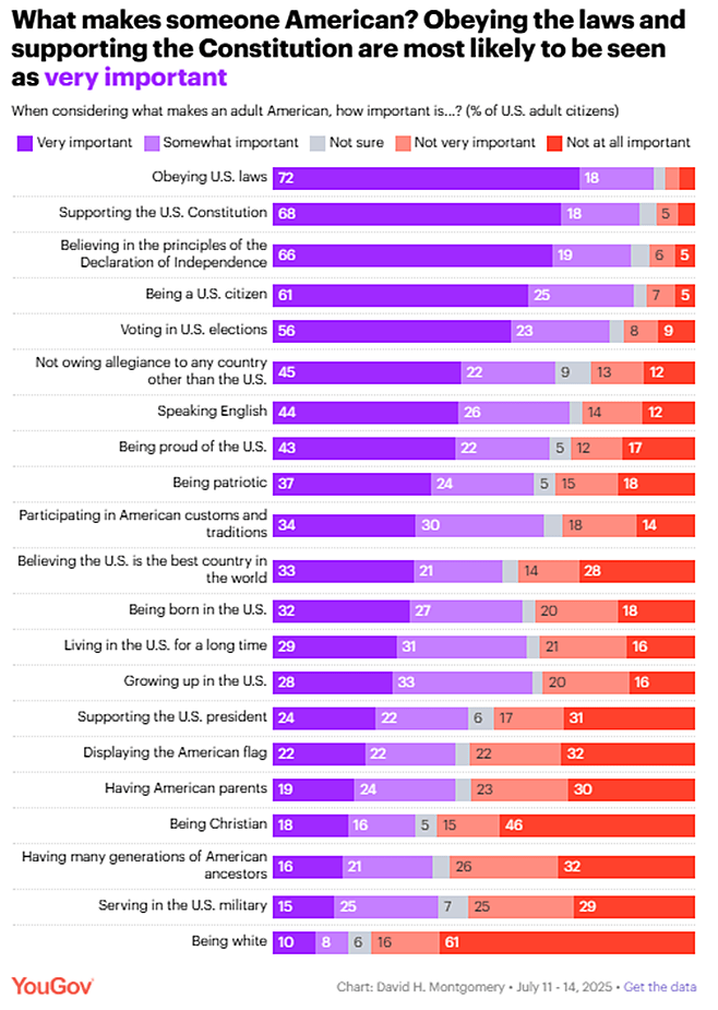 A recent YouGov poll asked, “What makes someone American?” Ranked in order of importance, the first unique cultural marker is speaking English, which is in seventh place. Tenth place is participating in American customs and traditions, which is as vague as you can be. Creedal definitions dominate: obeying the law, supporting the Constitution, citizenship, and adherence to shared principles. This is the way it should be. These are universal commitments, not ethnic markers, and therefore conflict directly with nationalist definitions of Americanness.
