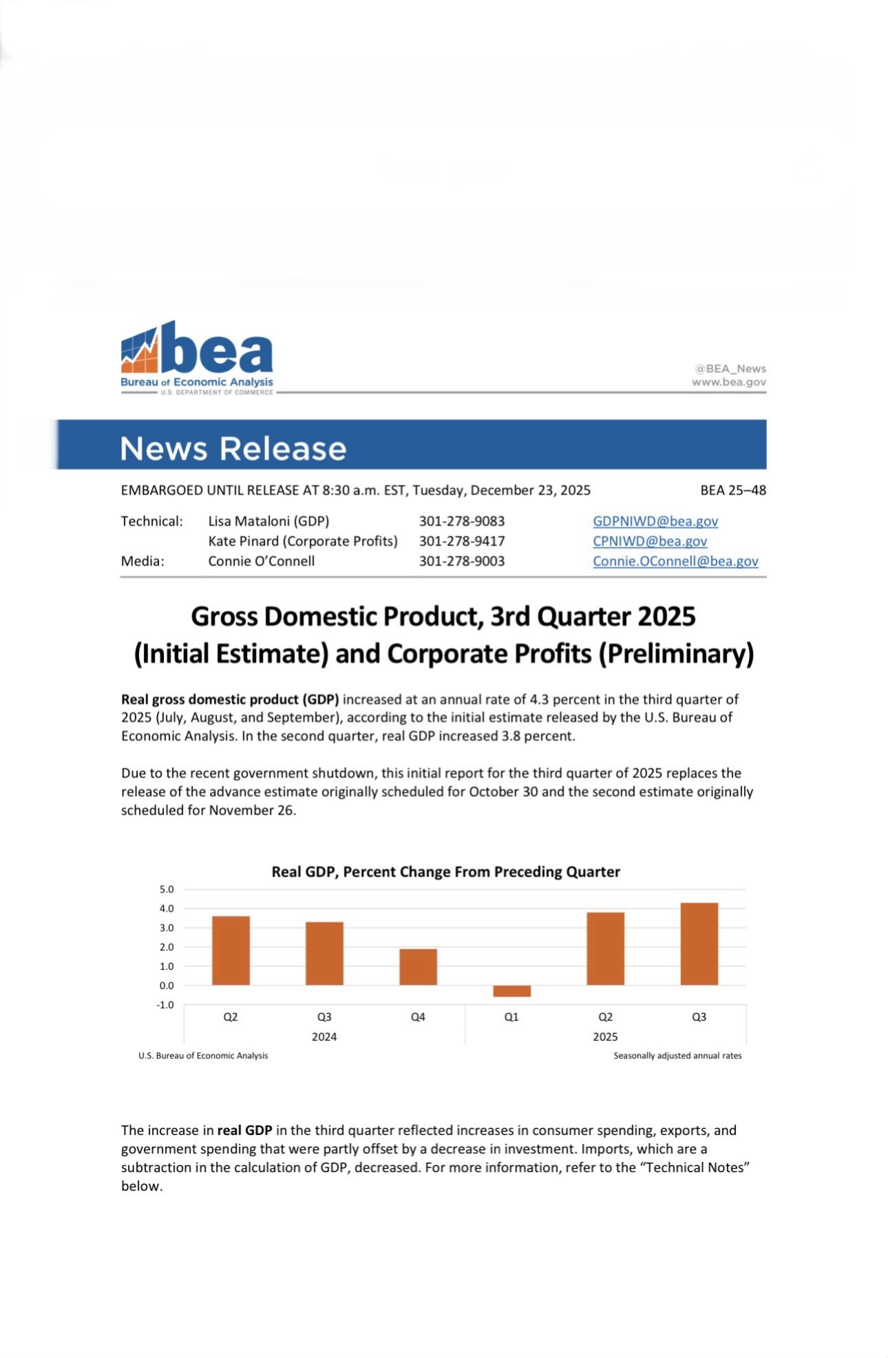 The headline sounds great where real GDP grew at a 4.3% annual rate in Q3 2025, up from 3.8% in Q2. In plain terms, that’s about 1.1% growth for the quarter, just expressed at an annualized pace.