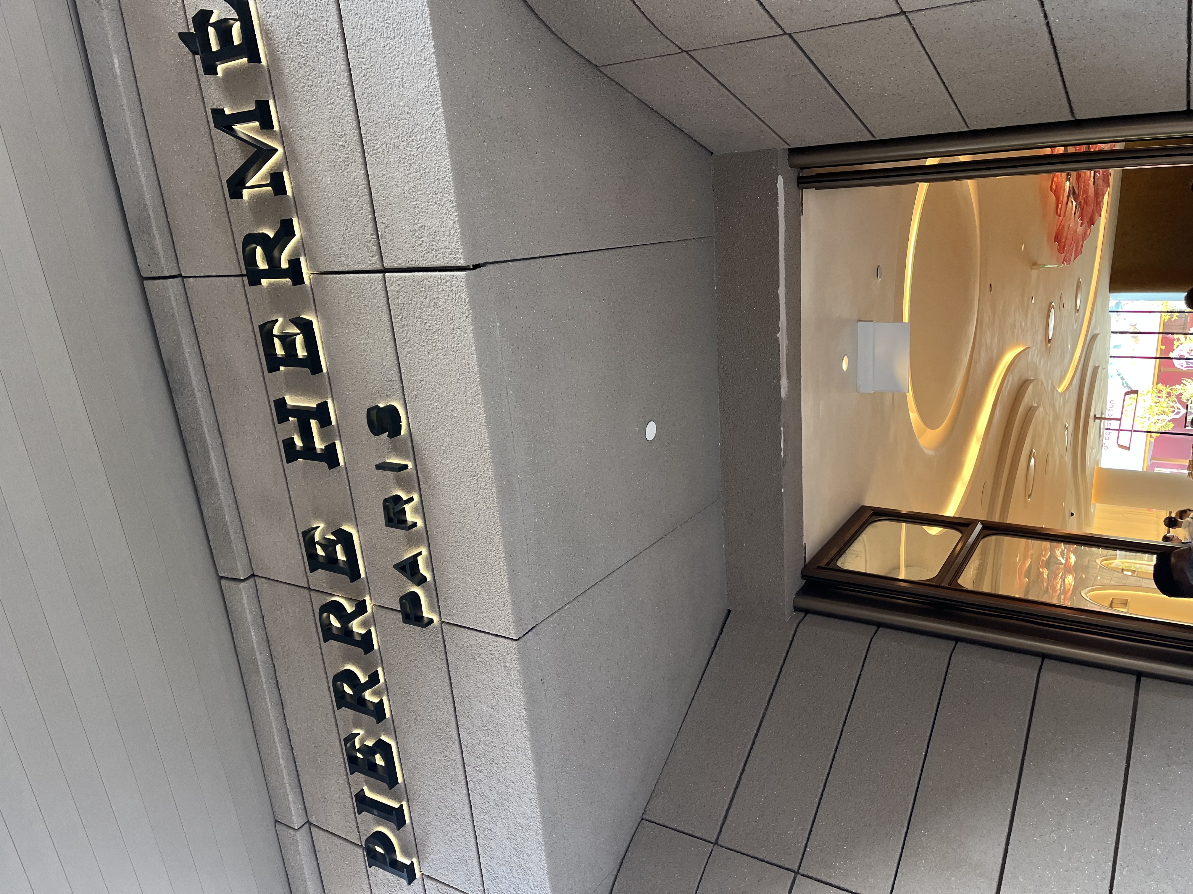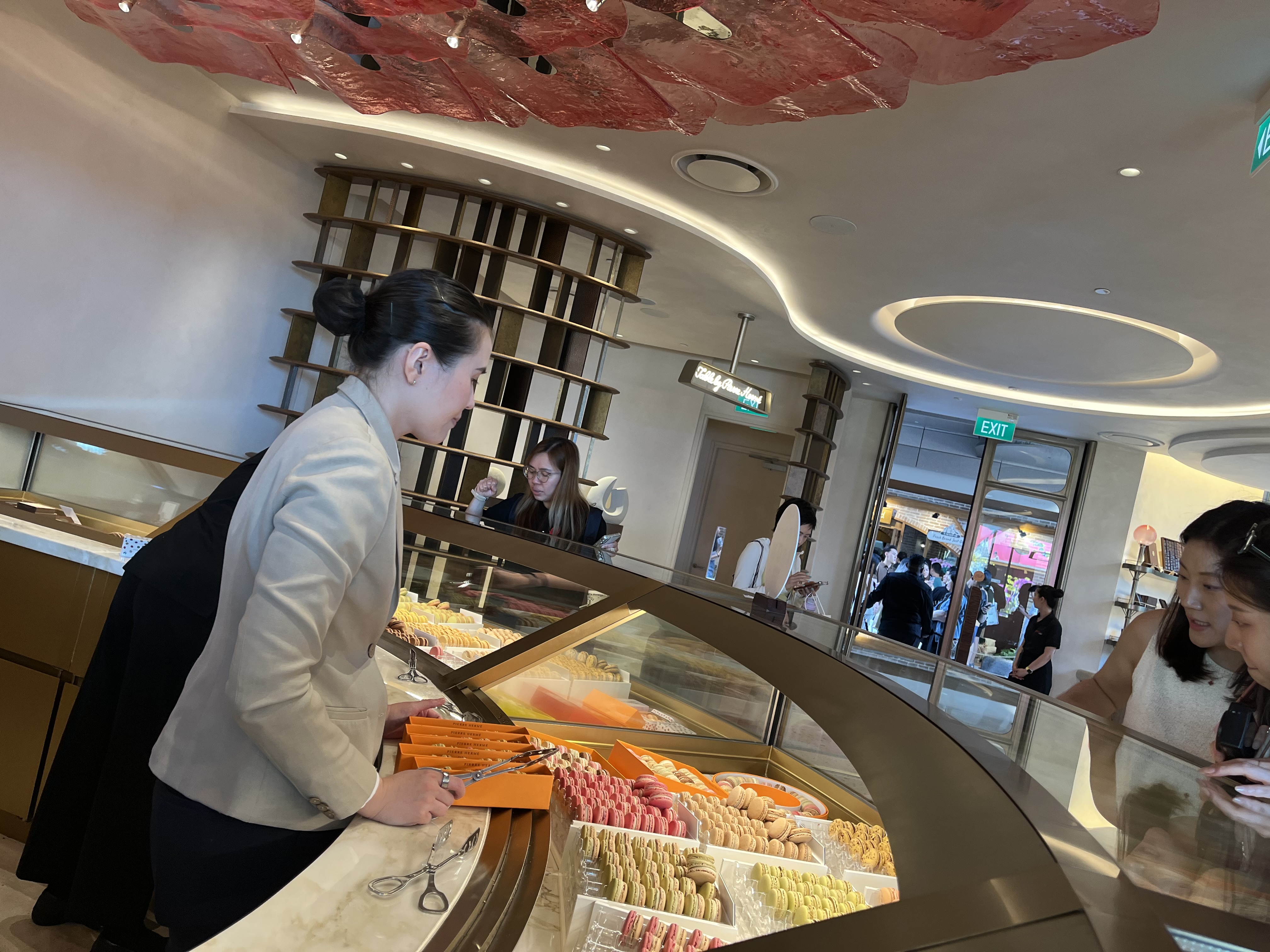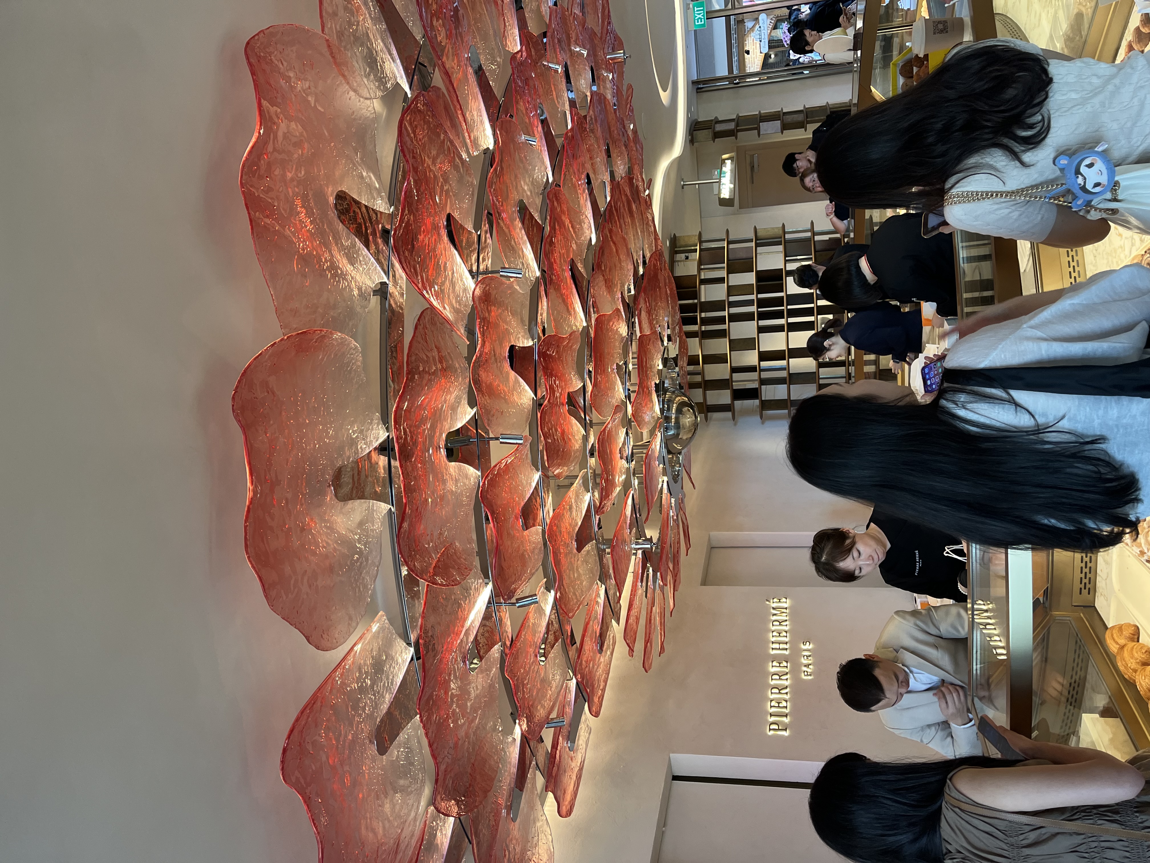 But since queueing is Singapore’s national sport (and because the wife wanted to buy macarons), I persevered and finally made it inside. The huge 360-.degree counter captivated my attention as the store’s centerpiece, whetting my appetite with its colourful array of macarons and chocolates. Complementing the counter was a luscious pink glass ceiling which resembled the petals of a flower. It contrasted sharply against the vertical wooden slats, each contributing warmth and depth in different ways.
