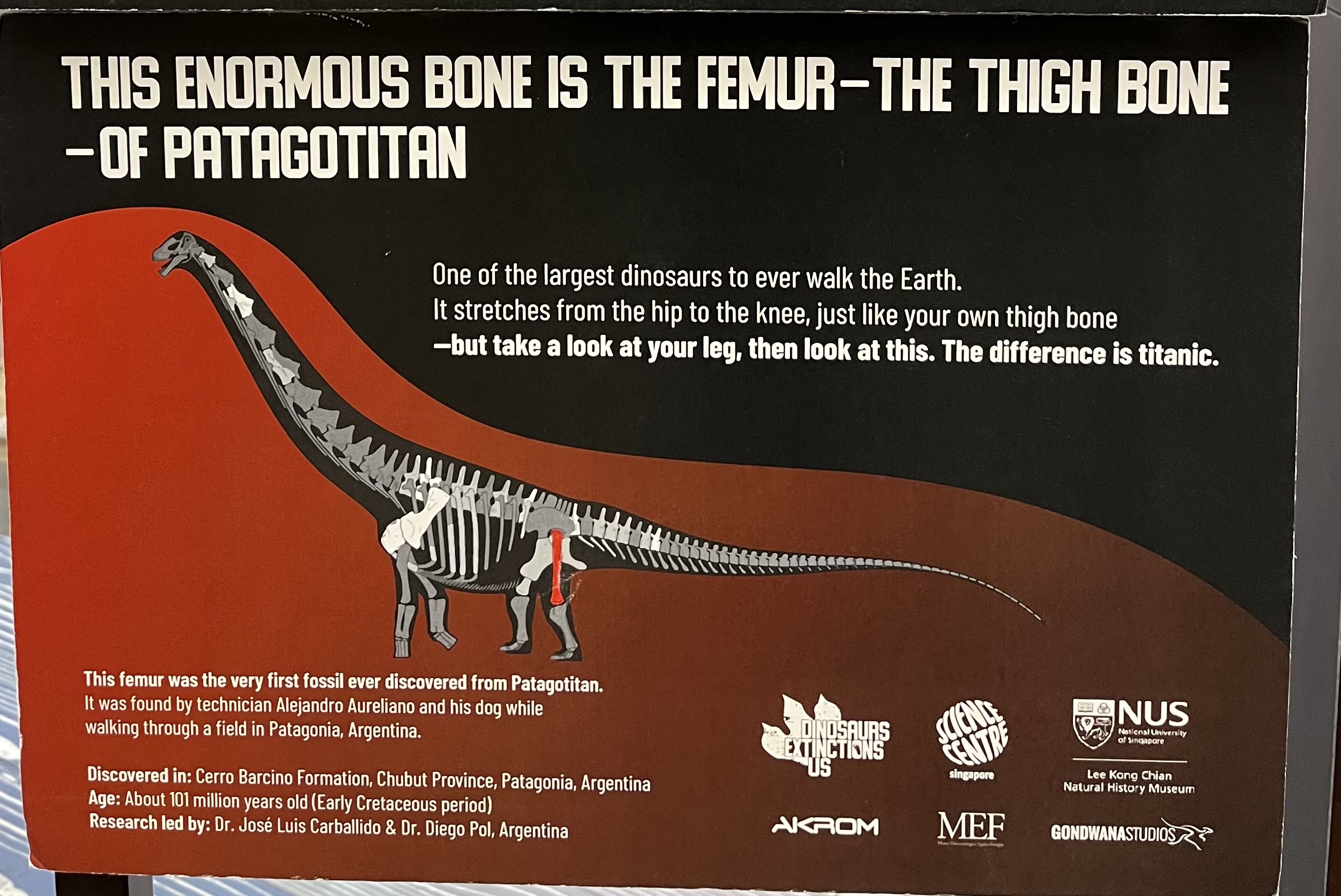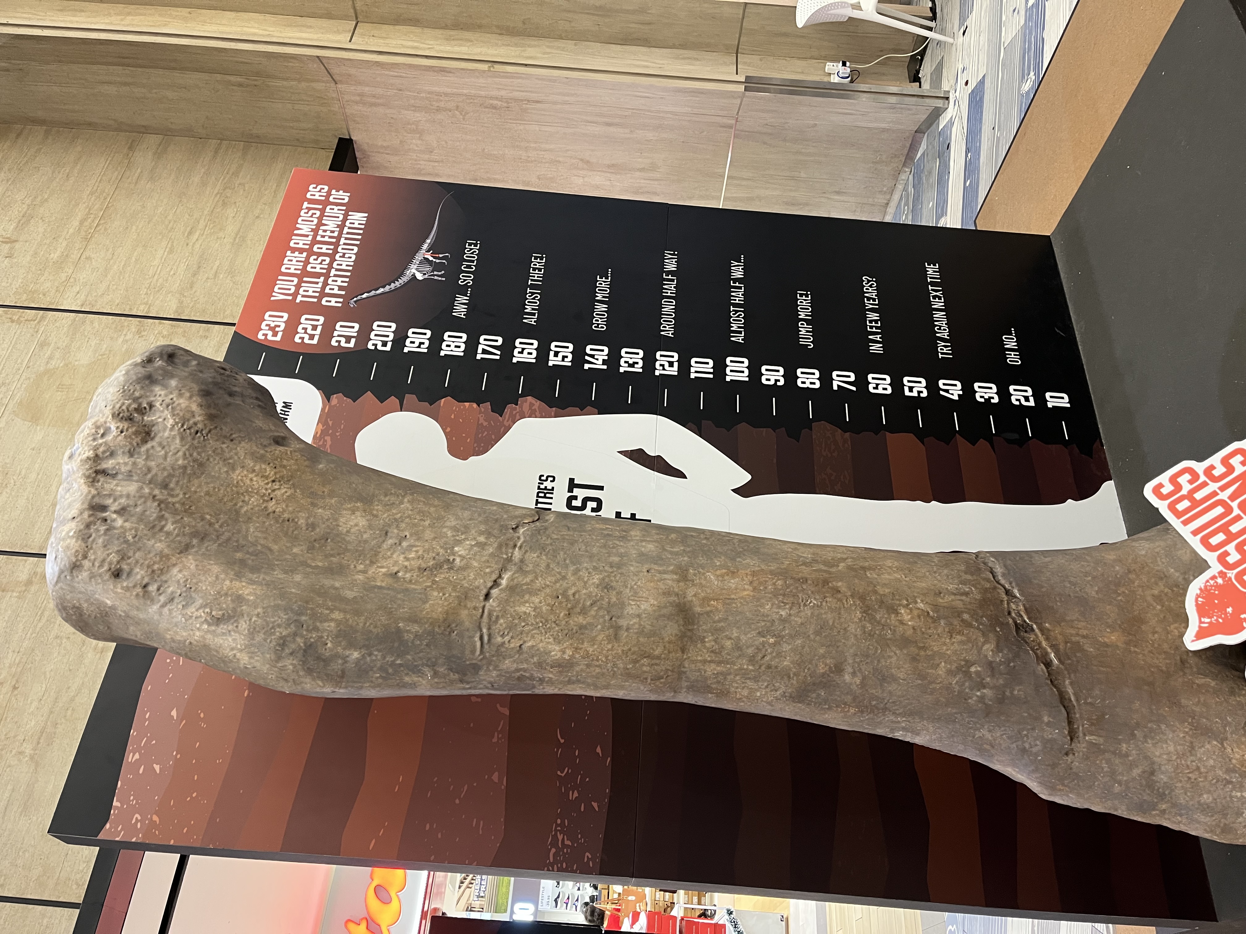 The best part of the exhibition was seeing the femur bone of a Patagotitan. I doubt it was real, but curious children don’t care about authenticity anyway. My children were eager to compare their heights with that of the bone.