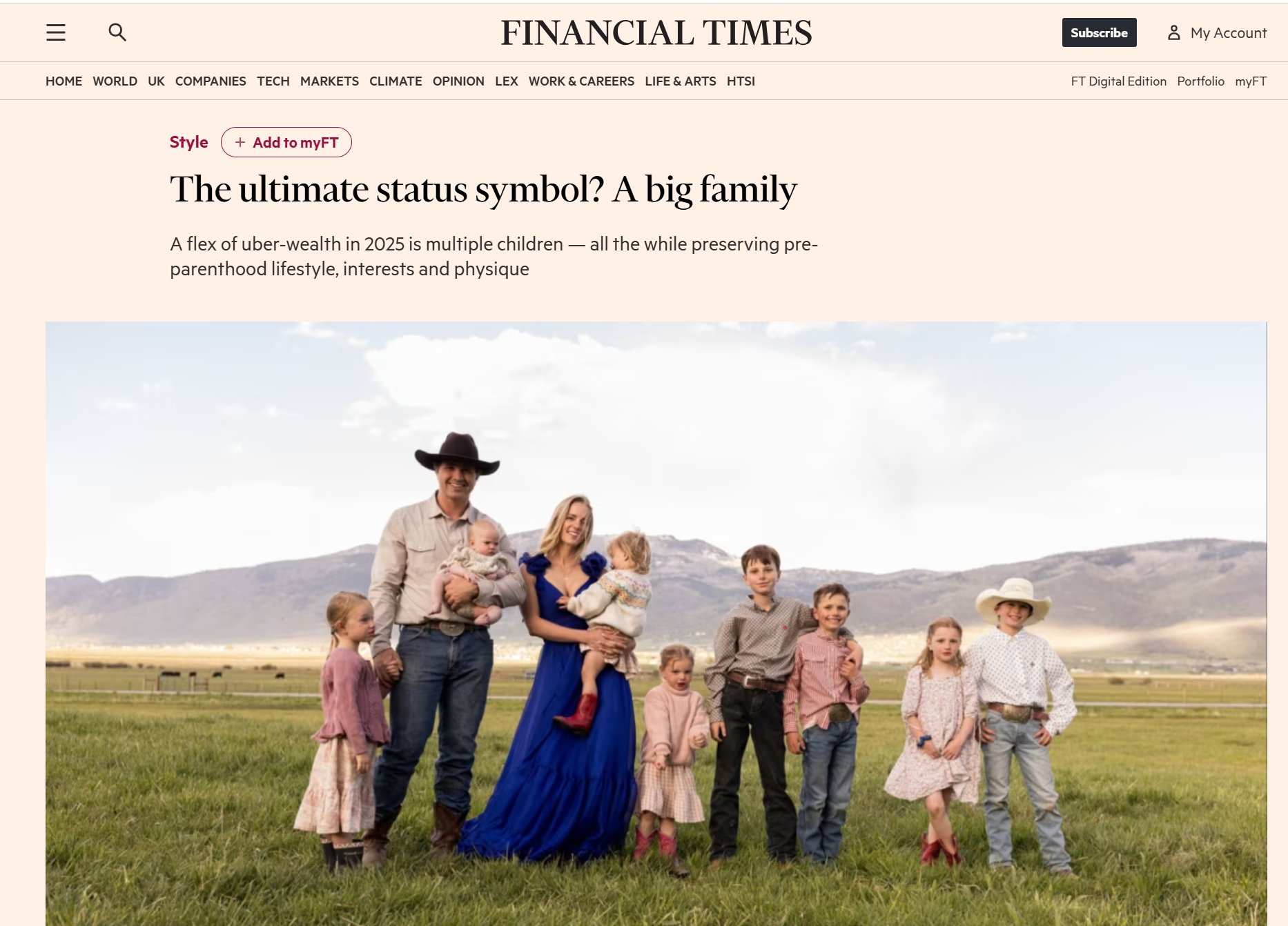 The deeper economic truth here is that reproduction at scale in affluent settings becomes a form of capital investment with heavy ongoing expenditure. It is a status game where the currency is not just money but the human capital and logistical machine needed to raise multiple children with a certain quality of life. In that sense it may be the purest form of the luxury flex today precisely because it cannot be bought in an instant. It must be sustained year after year which is why it remains unattainable for most and aspirational for many.