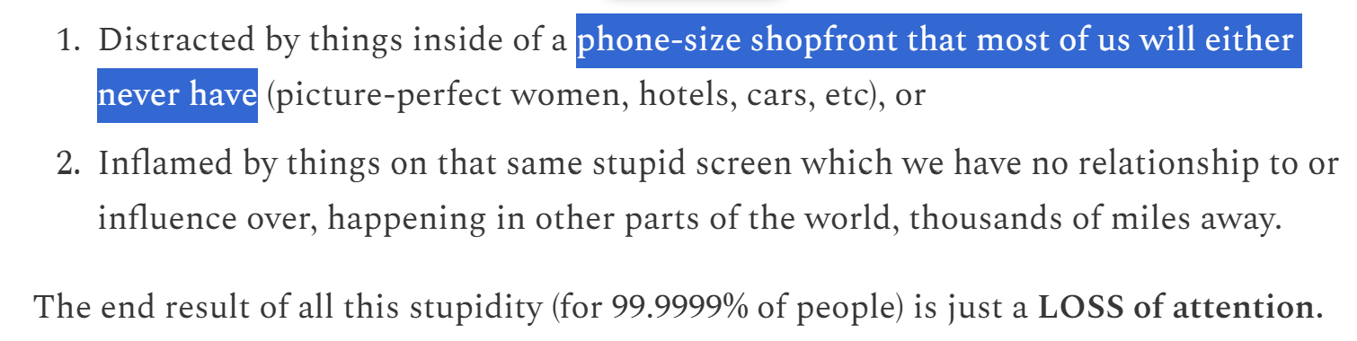 "I’m committed to treating my time and attention like the precious commodity that it is, and not a cheap trinket that I trade for whatever the algo or this ever-pervasive media-machine wants to draw my attention to.""I’m committed to treating my time and attention like the precious commodity that it is, and not a cheap trinket that I trade for whatever the algo or this ever-pervasive media-machine wants to draw my attention to."