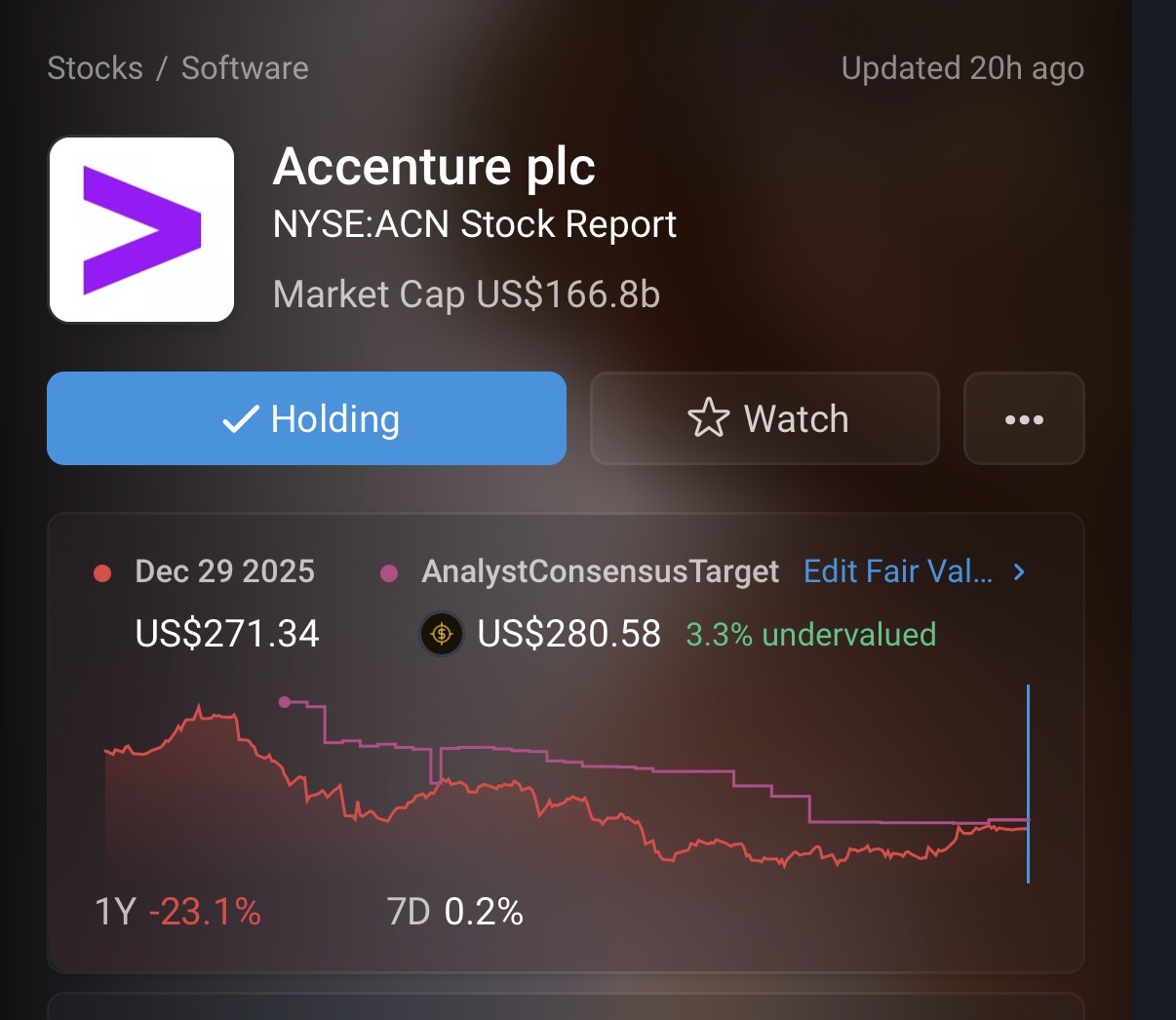However, this stock is suffering the same issues as Adobe, which is a great business but doesn’t show up in the stock price. Both companies have lost value in the last 4+ years due to weak growth projections and possibly the fear of AI disrupting ACN’s business model.