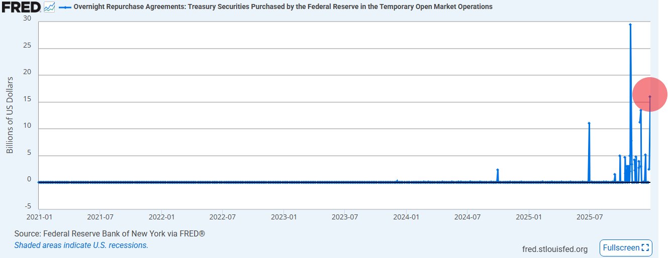 When people see the Fed injected $16 billion, it’s easy to jump straight to crisis thinking. I wouldn’t dismiss it, but I wouldn’t call it a bailout either. This is the Fed keeping the plumbing working. Overnight repos are short term cash for Treasuries swaps, used when funding gets tight at the edges and year end is when those edges usually fray. Balance sheets get defensive, risk limits tighten, and cash that was easy to borrow a week earlier suddenly isn’t. The Fed steps in early because it knows how fast a small funding hiccup can snowball if it’s ignored.