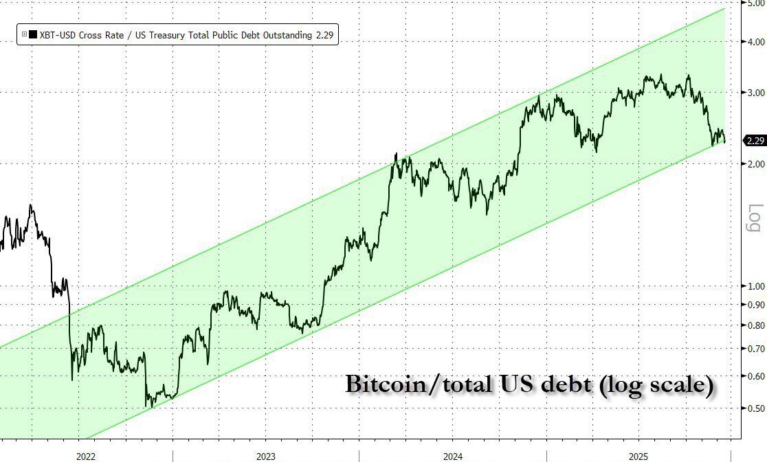 Even so, bitcoin priced in debt has been in an upward channel since 2022.