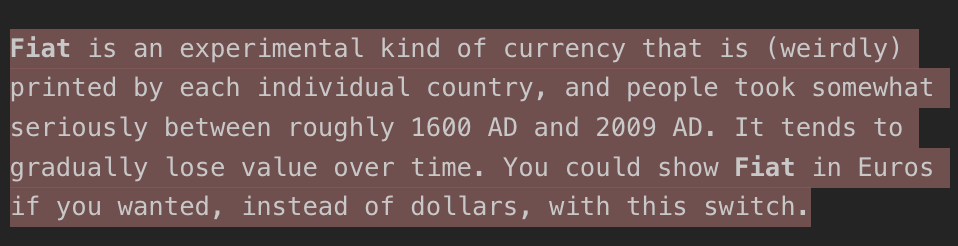 *Fiat is an experimental kind of currency that is (weirdly) printed by each individual country, and people took somewhat seriously between roughly 1600 AD and 2009 AD. It tends to gradually lose value over time. You could show Fiat in Euros if you wanted, instead of dollars, with this switch.*