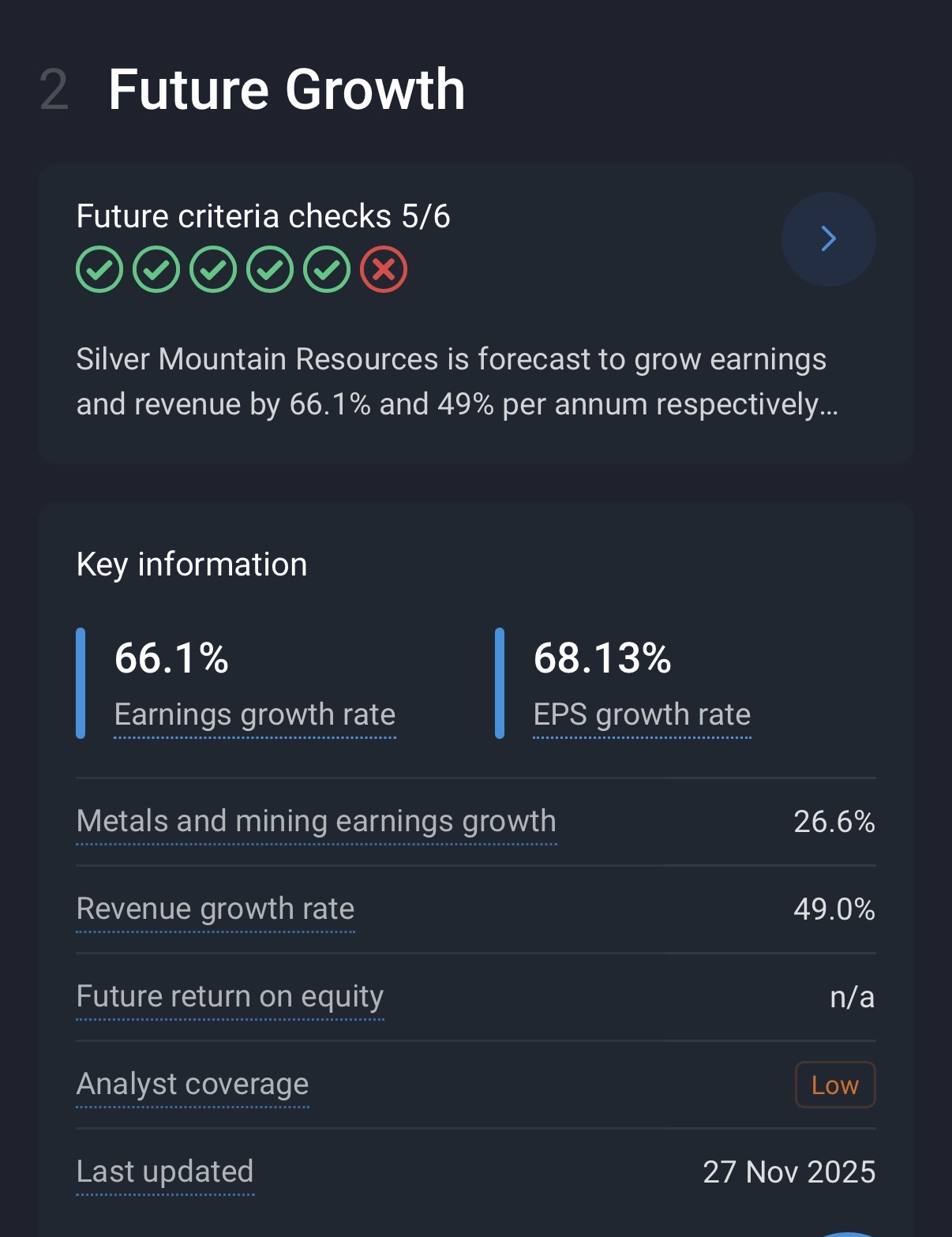 The company is expected to grow at a 60%+ clip, but the company is not profitable. Unless the data is wrong this company has no revenues! Just bleeding cash to fund operations which makes sense due to mining being a very capital intensive industry. The balance sheet is pristine with zero debt but how long will that last?