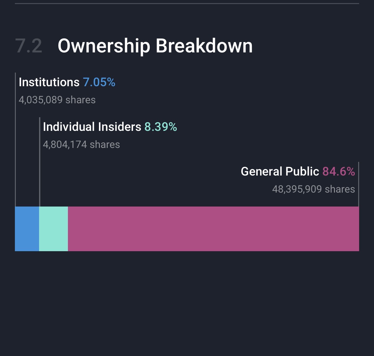 Retail owns 84% of the float! Which could be a bullish sign of Wall Street starts to place a bid on this stock. But bears would says retail has weak hands any crack in price may send this stock lower in a heartbeat.