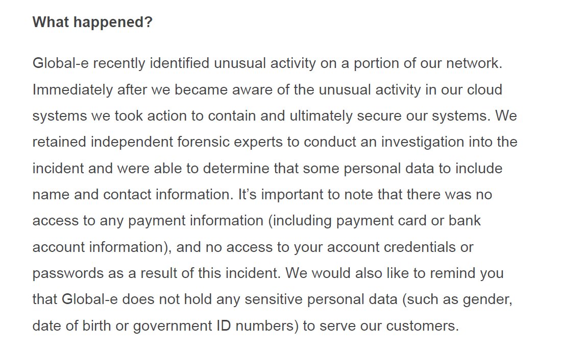 “We would also like to remind you that Global-e does not hold any sensitive personal data — such as gender, date of birth or government ID numbers — to serve our customers,” the company added.