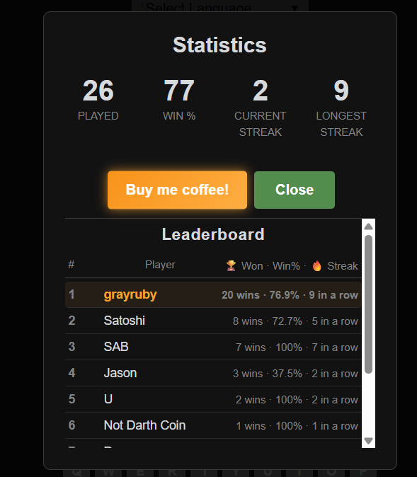 I may keep track of how many guesses people take on average to win at some point and include that in the rankings. I had it when the score was kept locally, but it seemed like a headache to do with the database.