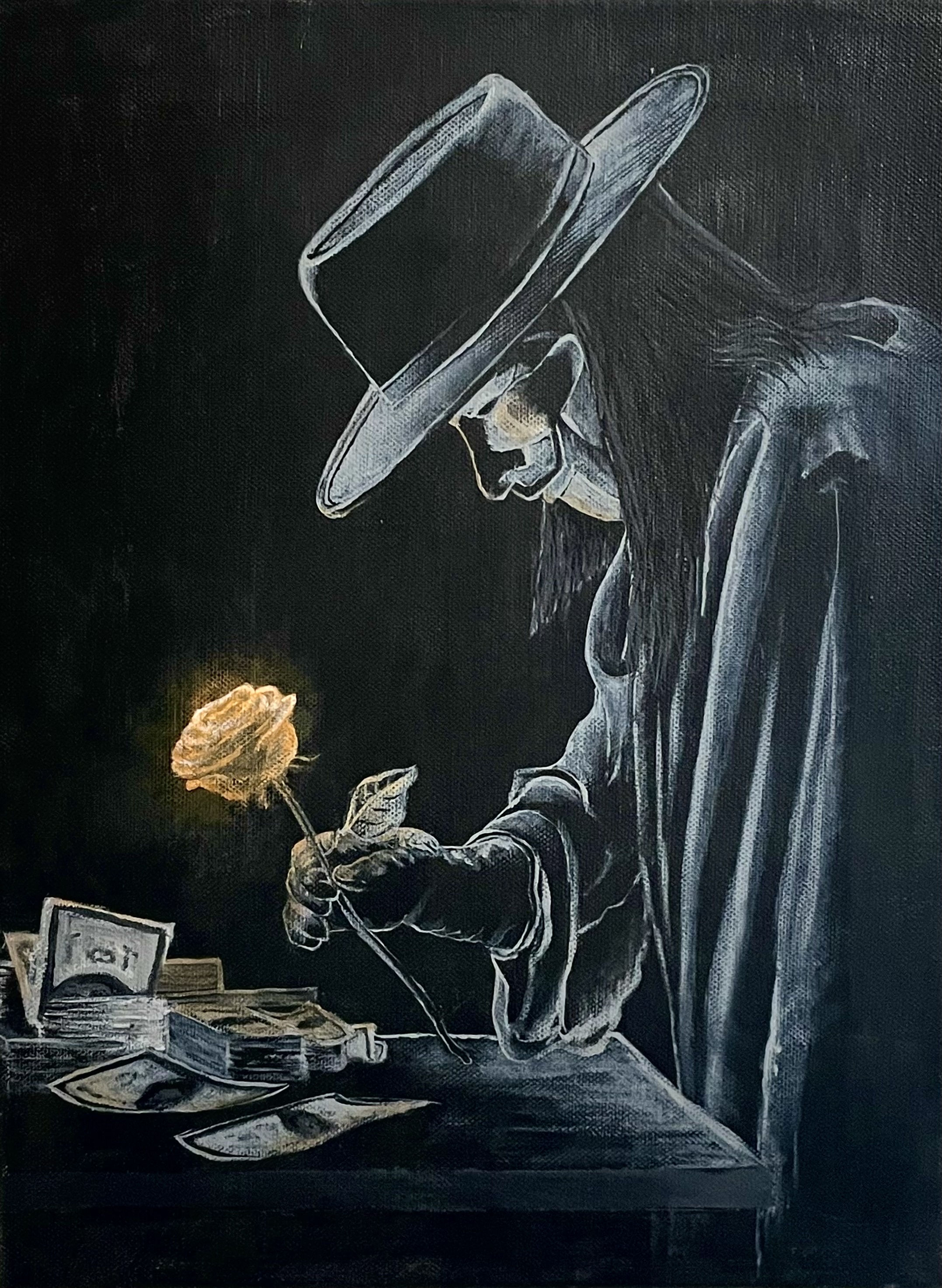 The rose that V leaves beside the fallen becomes, here, orange. A color associated with liberation and a flame of hope. The spark of an invention that questions the monopoly of our value. The flower rests upon a pile of government-issued money. Money stained with blood all over the planet. It is not a mere dramatic effect, it is an accusation. Fiat money (from the Latin fiat lux, let there be light) was and continues to be an instrument of control, a mechanism that seizes savings, commands obedience, and finances wars.