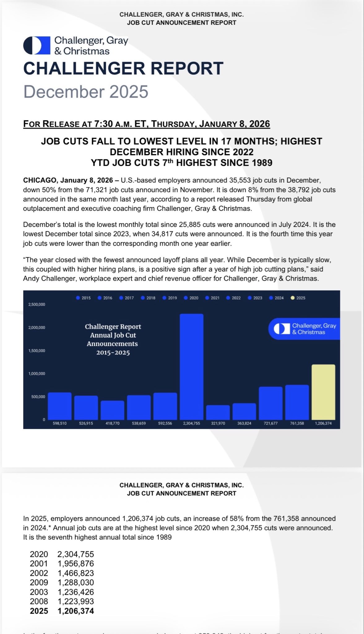 For all of 2025, employers announced 1,206,374 job cuts, up 58% from 2024 and the 7th highest annual total since 1989. That’s not noise. That’s a late cycle signal.