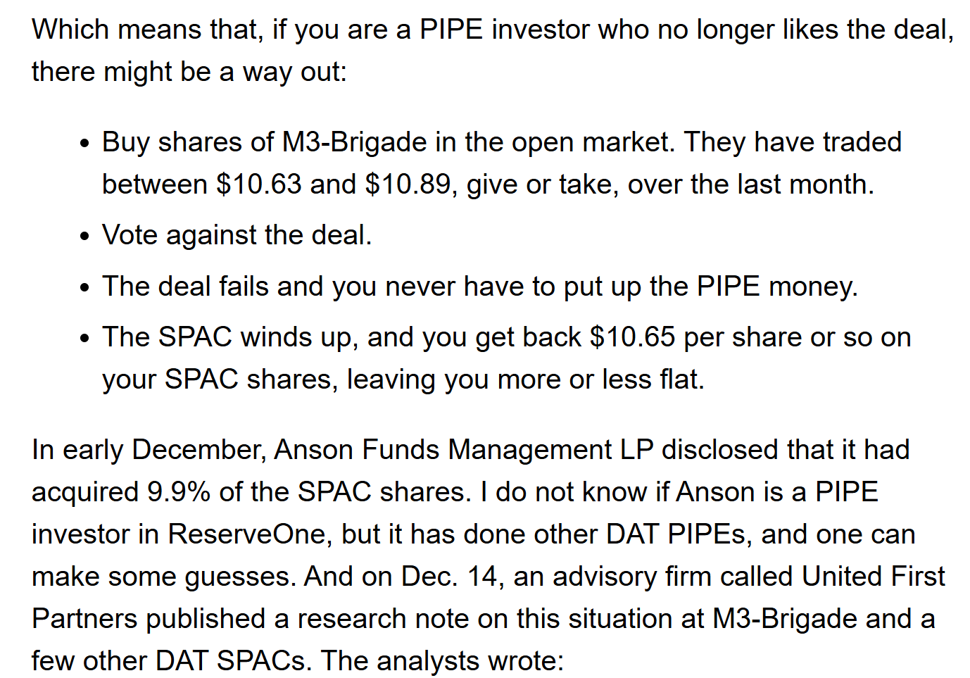Alright, so ReserveOne, was one such "DAT," sponsored by M3-Brigade, a SPAC. Idea was, raise a bunch of investor schmuck money in a PIPE deal, together with the SPAC-money already sitting on a NASDAQ listing, use all the funds to buy bitcoin (and solana and stuff). Profit.